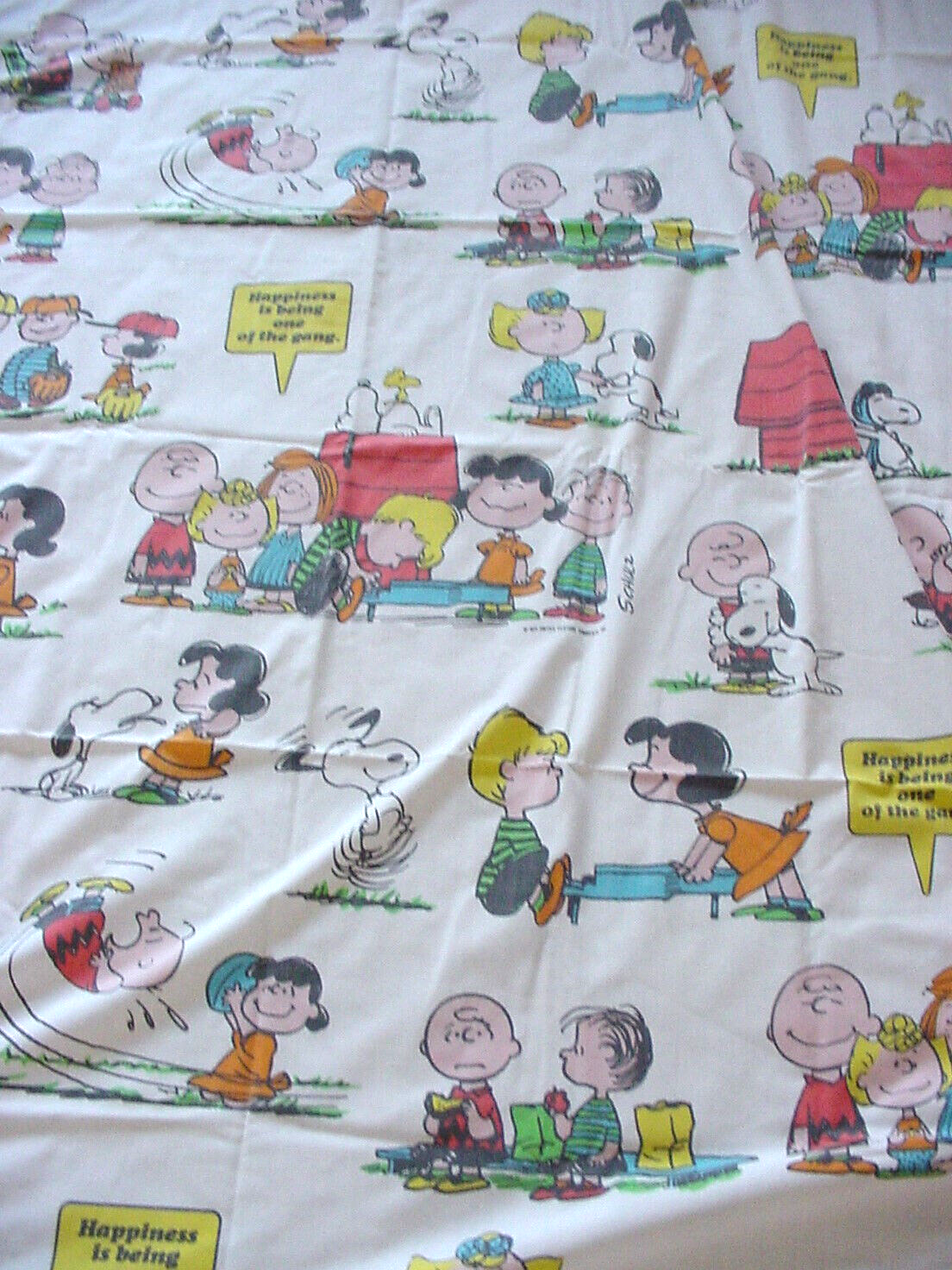 1970s Charlie Brown Peanuts Twin Flat Sheet "Happiness is being One of the Gang" Snoopy, Charlie Brown, Peanuts Gang Happiness Is 1971 sheet, 50% Cotton, 50% Polyester. Made in USA, Twin Flat 66 x 104 designed to fit 39 x 76 Mattress. Machine Wash. From 1971, in very good condition, this is a twin flat sheet. The sheet has really vivid colors throughout, no holes or rips.