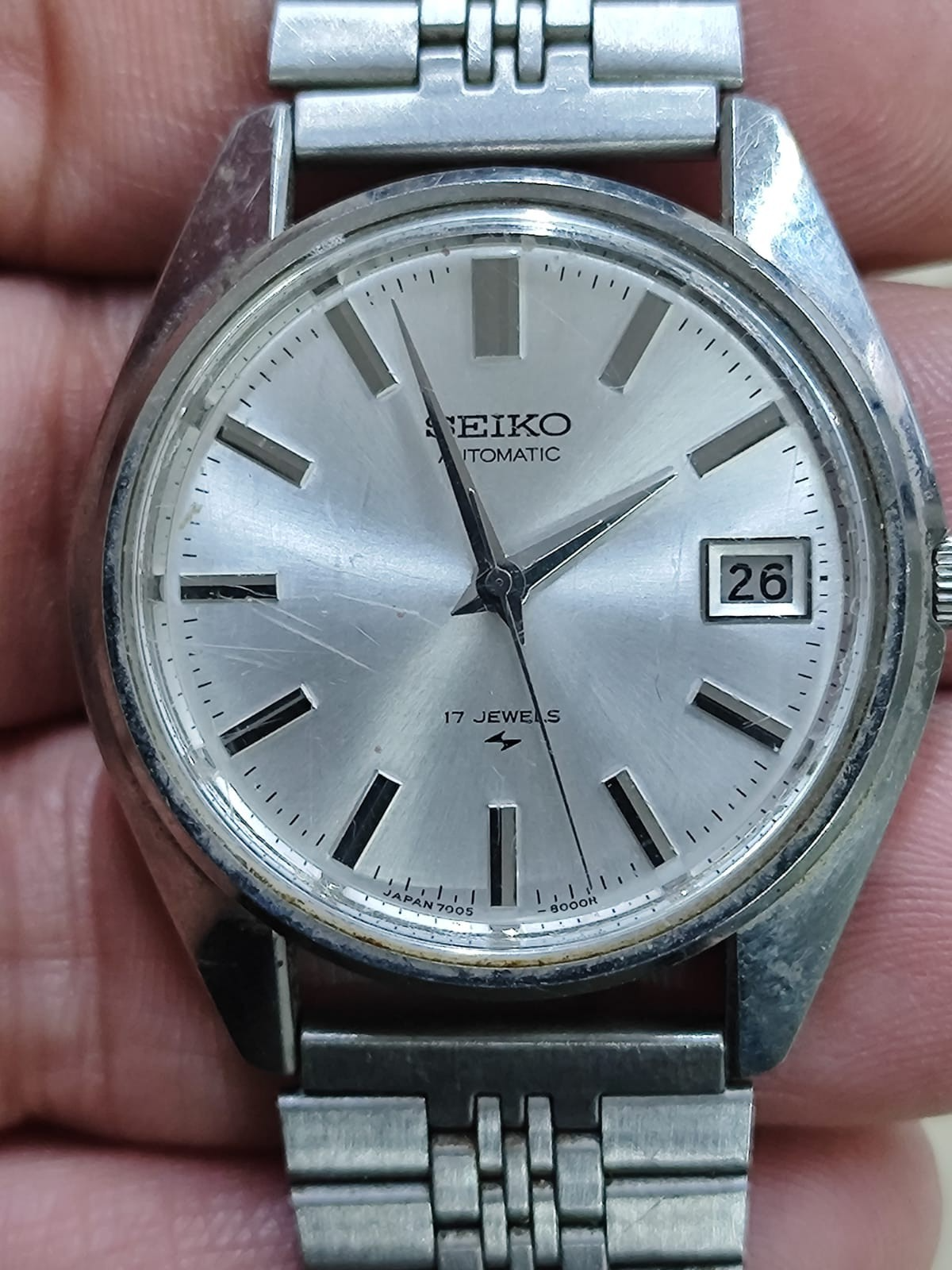The product is a 1971 vintage Seiko 7005-8000 automatic watch with a white dial, made in Japan. This watch features a mechanical (automatic) movement, which is compatible with Seiko branded watches. The brand's reputation for quality and durability ensures that this timepiece will be a valuable addition to any collection or for repair and restoration of other Seiko watches.