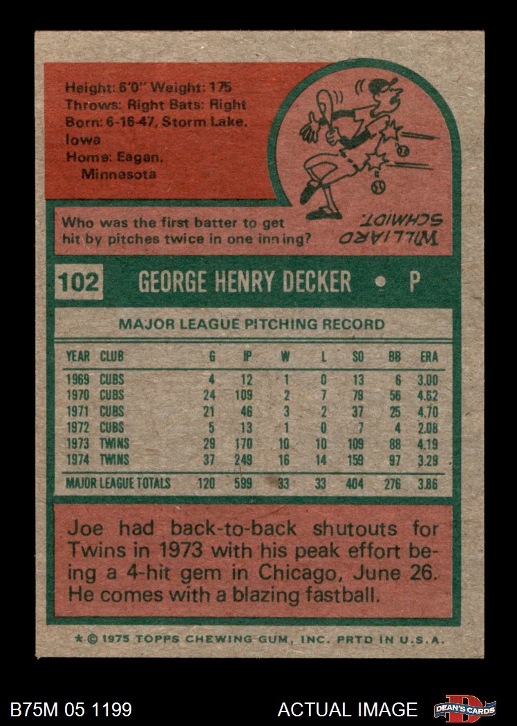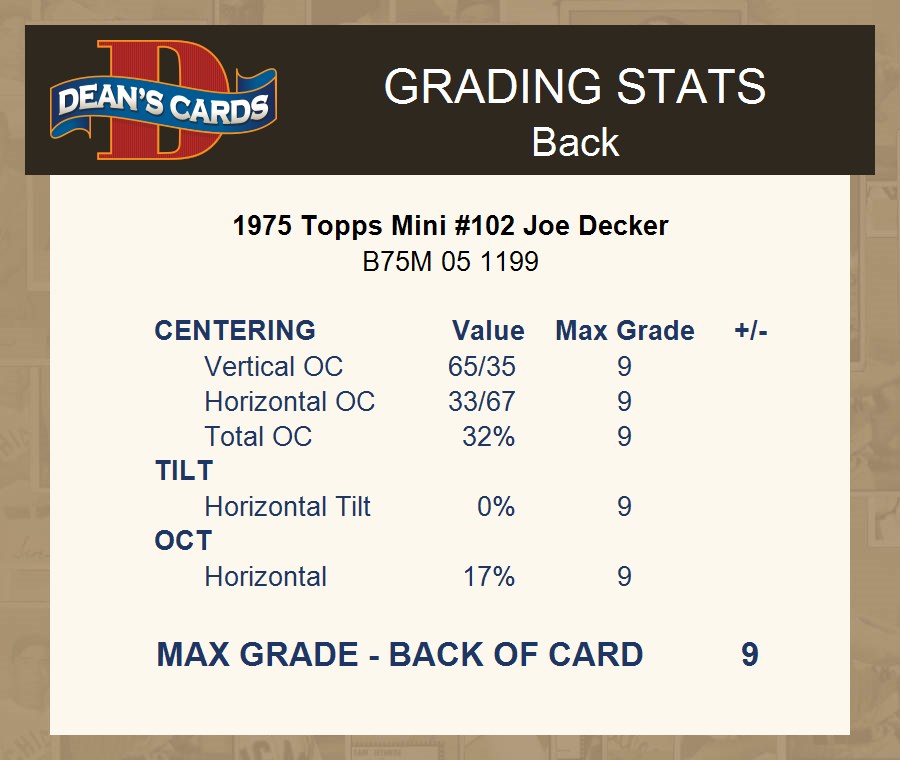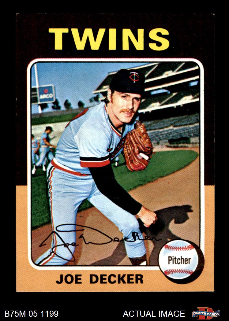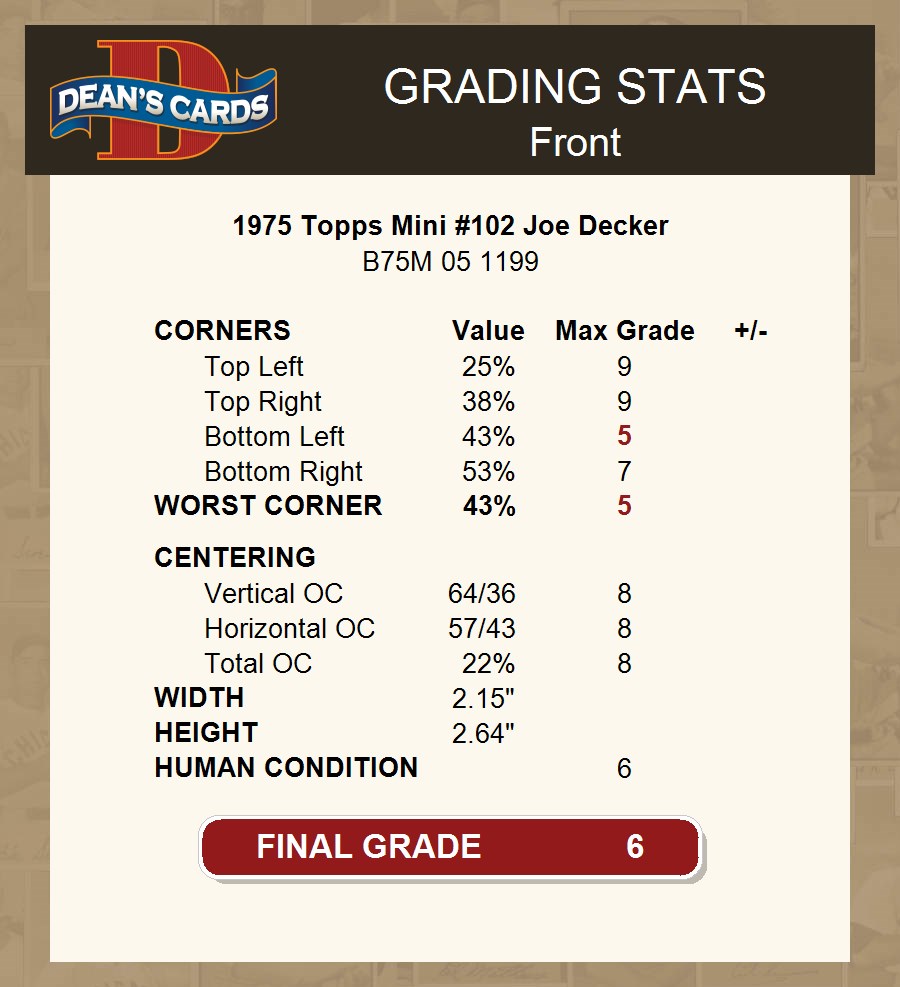 1975 Topps Mini #102 Joe Decker Twins 6 - EX/MT If the scan in the listing says ACTUAL IMAGE, you will receive the card pictured. For cards issued after 1983, we will often use representative images and you will not receive the exact card pictured. Shipping Policy You only pay shipping on the first item. If you order multiple items on the same order, you will only be charged once for shipping. We do not combine shipping on multiple orders. To avoid multiple shipping charges we recommend using eBay's "Add to Cart" feature to check out multiple items in one transaction, or please request and allow for us to send an invoice to reflect the combined shipping charges. Canadian customers - We send all of our Canadian/International packages with tracking and cannot make any exceptions to this policy. Negotiating Prices All prices are final and we do not negotiate. This policy is to ensure that everyone knows that they are getting our best possible price. So please do not ask us to negotiate on price. Return Policy Dean's Cards has a 100% Money Back Satisfaction Guarantee on all purchases, as long as the product is returned within 30 days of receiving the product. Card Grading Each card is first reviewed by a member of our team, in order to detect any flaws that may not be visible on a scan, such as wrinkles, creases, print spots, or light stains. The vast majority of our vintage cards are professionally graded by the Dean's Cards Grading Software and include a 100% satisfaction guarantee. Our grading is on par with PSA standards when it comes to corners, centering and flaws - and tends to grade a bit tougher than PSA, on cards with a tilted image or rough edges. This grading software was developed to provide far better grading and consistency than can be achieved using the human eye. Determining the card's grade The sharpness of the corners and the degree to which a card was cut off-center determines the maximum possible grade that the card can receive. The card's grade is further reduced by any flaws or blemishes that it may have. Each card is evaluated on the following characteristics and assigned a score. Corners - Each corner of a card is individually analyzed, and then assigned a score on how square, sharp, and flawless it appears. Centering - The borders are measured, at multiple points along the edge, to determine the horizontal and vertical centering and tilt. Defects - The card is examined for imperfections, such as: size, print flaws, dings, stains, creases, or other wear which could lower its grade. Bonus for Perfect Centering - A vintage card, with near perfect centering, is given a one-half grade bonus. So when you buy one of our cards with a half-grade (e.g. 3.5 or 6.5) it will appear perfectly centered, both vertically and horizontally. Grading Criteria Worst Corner - A card can grade only as high as the worst corner will allow. Average Corner Tilt - The difference in width of a card border near the top, compared to the bottom. OCT - The sum of how far a card is Off-Center, plus its Tilt. Minimum Centering Requirements Eye Appeal - The combination of a card's centering, corners and tilt. Well-Centered - Cards that appear perfectly centered receive a bonus of one-half grade. Flaws, defects and other imperfections - can lower a card's grade. Card Backs - the above criteria is also considered, for the back of the cards, but does not inflict as severe of a penalty to its grade. Packaging Once scanned, the cards are placed in "soft" sleeves, which have an open top for easy removal. The Dean's Cards label is placed on the top back of the card sleeve. Every card you buy features a QR Code that you can scan to see your ACTUAL CARD and its grading statistics. Please note that when images are enlarged there may be instances of vertical lines running through the scans. This was caused by a "dust speck" on the scanner and can be verified by the vertical lines running into the black margins on the top and bottom of the image. About Dean and Dean's Cards Dean's Cards Makes Card Collecting - Fast, Easy And Fun. Dean's Cards was founded in 2002 and has become the leading online seller of vintage sports cards and non-sports cards. Our inventory has grown to more than a million vintage cards and we have a staff of 15-20 employees and a 8500 sq. ft. office space in Cincinnati, Ohio.