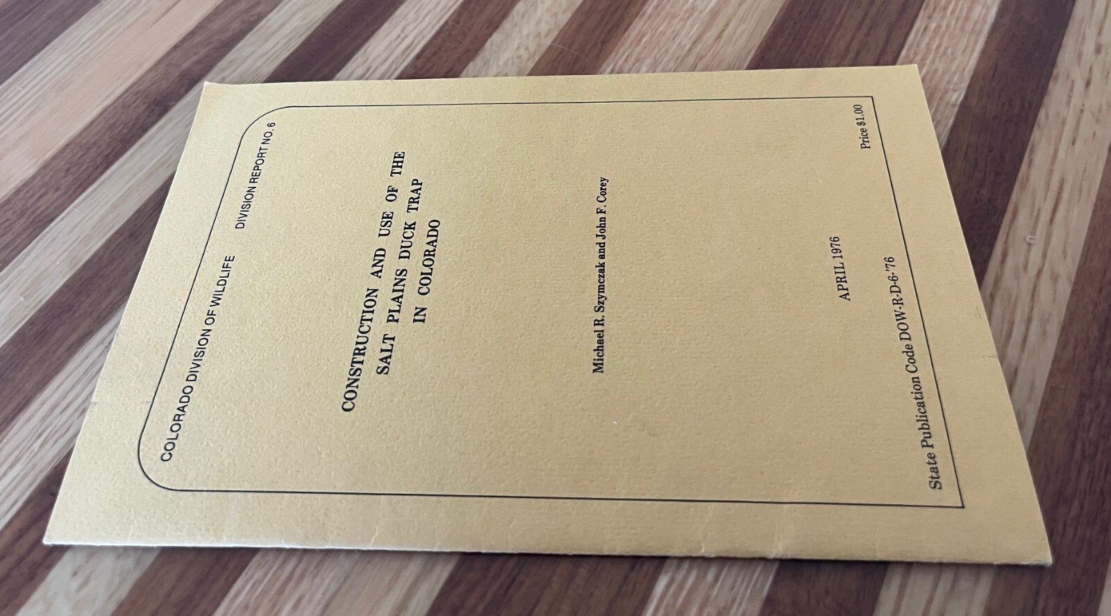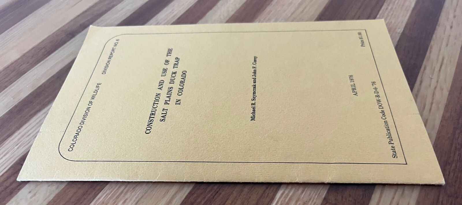 'Construction and use of the Salt Plains Duck Trap in Colorado,' 1976, Colorado Division of Wildlife, Division Report No. 6. by M. R. Szymczak and J. F. Corey. Trade Paperback, Staple Bound. 13 pages. The top of the document's cover has a mark/imprint from a paperclip. The top edges of the document are slightly bent. There are very minor stains on the front and back cover. See Pictures.