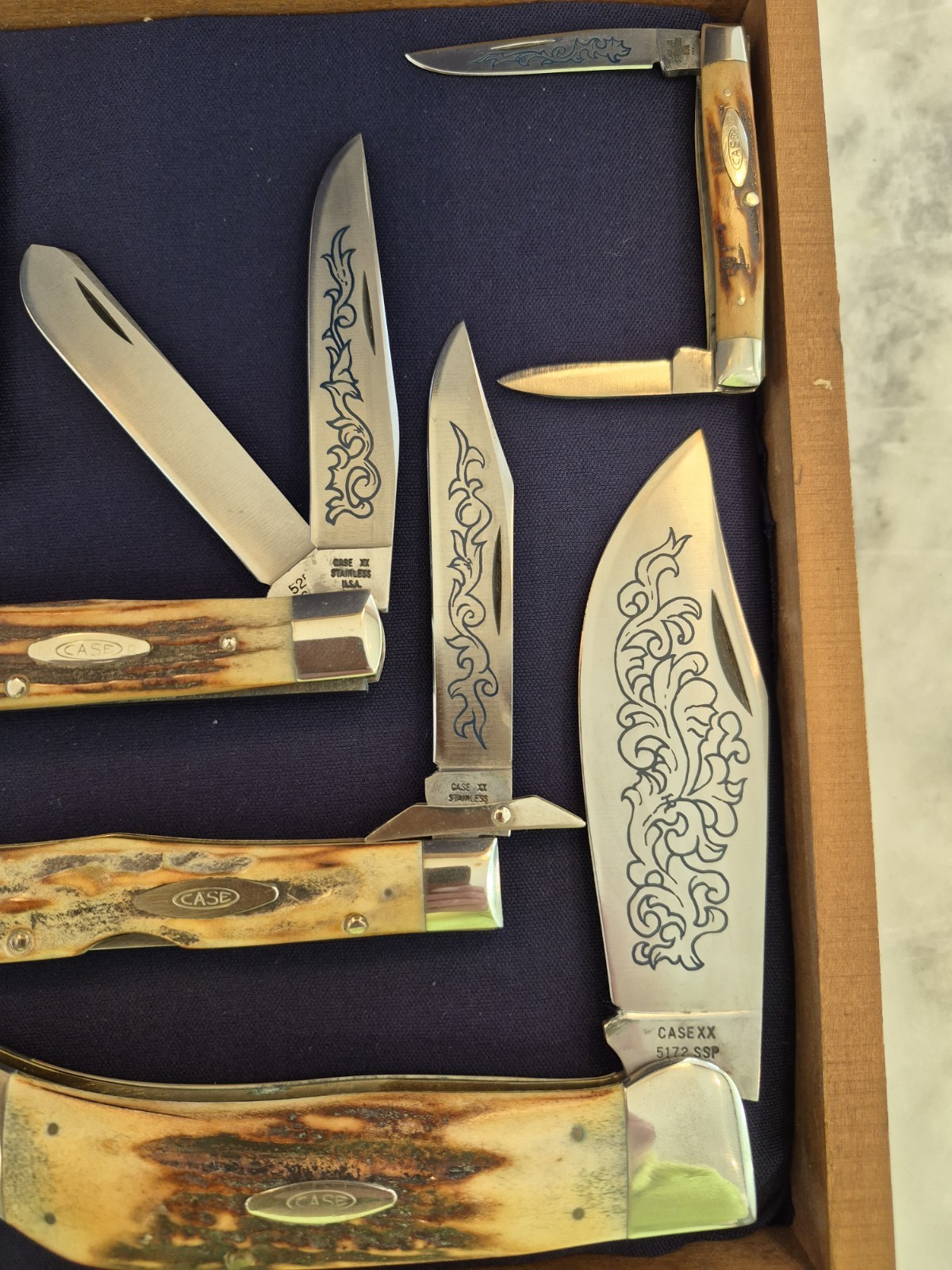 This 1977 Case XX Blue Scrolled 8 Piece Stag Knife Set features a set of vintage folding knives made in the United States. The knives are crafted with stainless steel blades and ambidextrous handles made of stag or antler material. The set includes knives with clip point, pen, and spey point blades, all housed in a wooden case. Perfect for collectors of unique and original knives, this set is a rare find for those who appreciate the craftsmanship and history of Case XX knives. These knives have never been used or carried. They are in great shape, see the pics to appreciate! Thanks for looking.