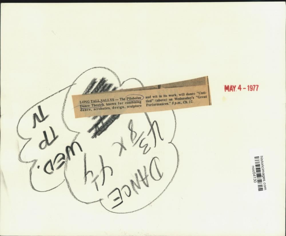 ebay template Note: Please study the images carefully to determine the condition of this vintage photograph, as it may not be in perfect condition. It may contain wrinkles, cracks, and possibly even tears due to its age and how it was handled before it got to us. A scanner may interpret colors and contrast differently than human eyes will, so it is possible that the actual photograph may be slightly darker or lighter in person. This vintage photograph is offered for sale as a collectible item and conveys no transfer of copyright. 1977 Press Photo Pilobolus Dance Theatre performing "Untitled" on PBS This is an original press photo. Pilobolus Dance Theatre known for combining dance, acrobatics, design, sculpture and wit will dance "Untitled" when they appear on Great Performances Wednesday, May 4 at 8:00 p.m. over the Public Broadcasting Service. This program is made possible by the National Endowment for the Arts, the Corporation for Public Broadcasting and Exxon Corporation. Photo measures 10 x 8.25 inches. Photo is dated 05-4-1977. PHOTO FRONT PHOTO BACK Historic Images Part Number: noo54130 Sell Smarter with Kyozou. Inventory and Ecommerce Management
