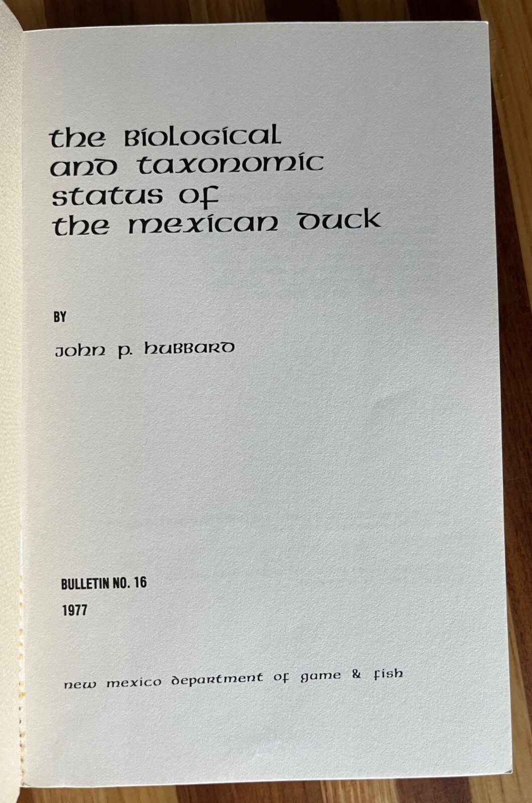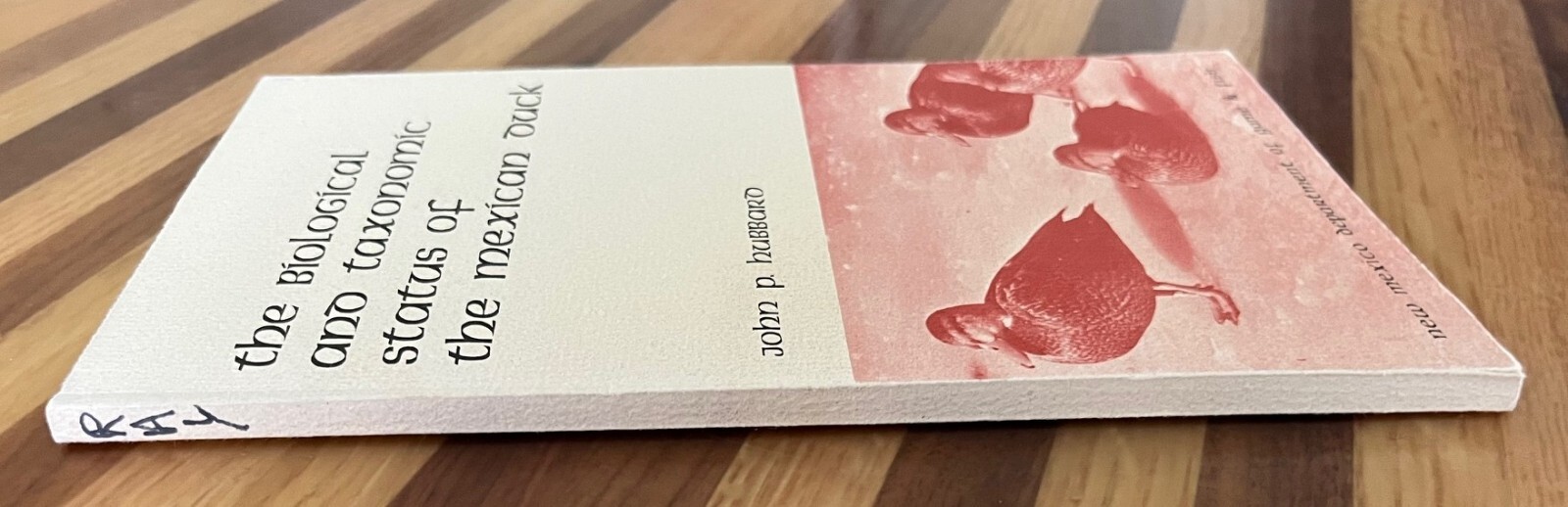The Biological and Taxonomic Status of the Mexican Duck, 1977, by J. P. Hubbard. Published by New Mexico Department of Game and Fish. 56 pages. Trade Paperback. The cover of the book has mild wear due to age and due to storage against other books. The spine has a name printed near the top. Some discoloration (slight yellowing) of the cover and pages due to age. If more than one book is purchased, I will combine into one shipment to reduce postage costs. Savings will be returned to the buyer.
