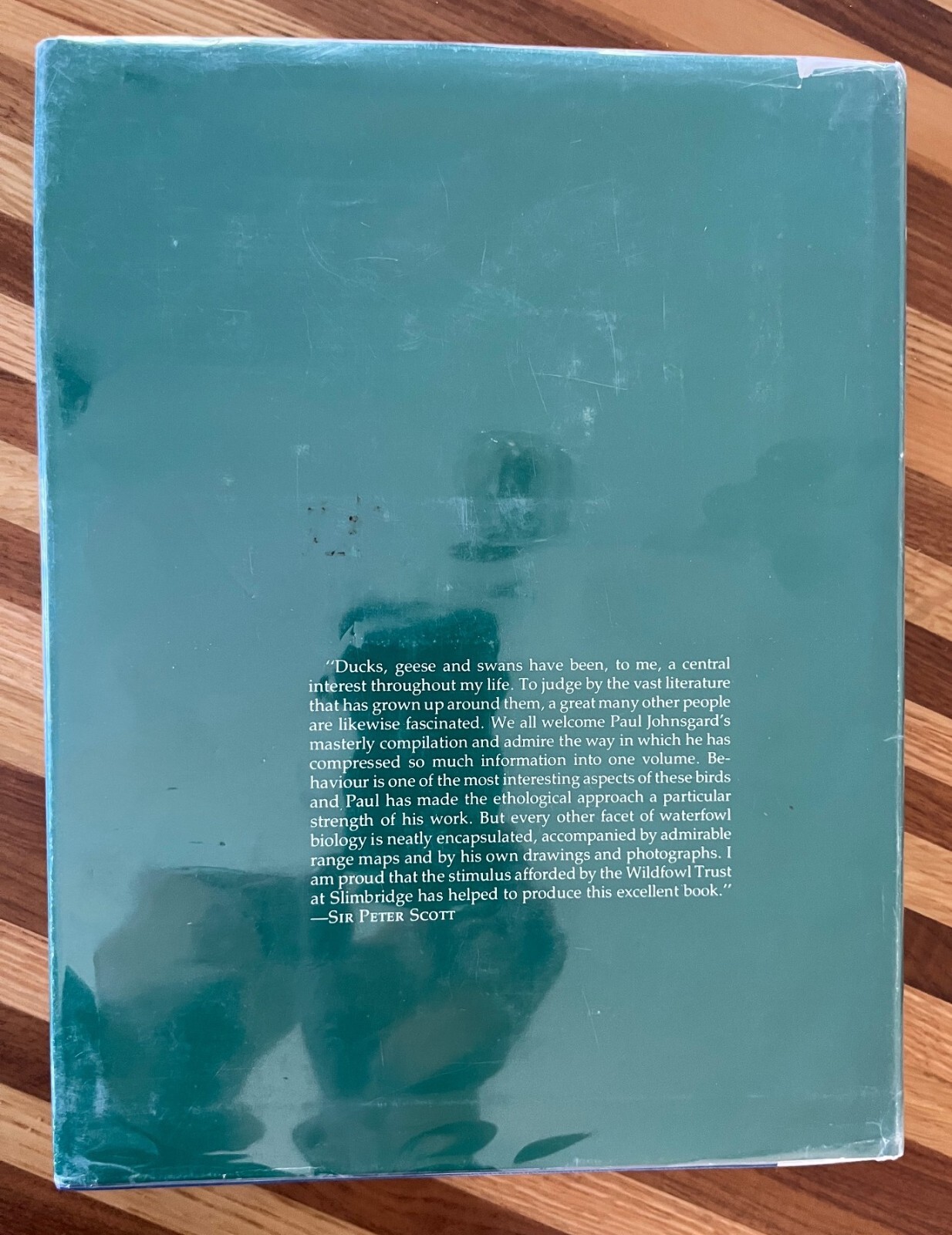 "Ducks, Geese, and Swans of the World," 1978, by Paul A. Johnsgard, Published by University of Nebraska Press, ISBN: 0-8032-0953-3, 404 pages. Hardcover, Dust Jacket. Nice condition. The hardcover of the book and its text are in great condition. The dust jacket is wrapped in a plastic, polyfit. The polyfit wrapper has rubbing and signs of wear. The dust jacket has chips and a few tears around the edges. If not for the condition of the dust jacket, this listing would be 'very good'. SEE PICTURES