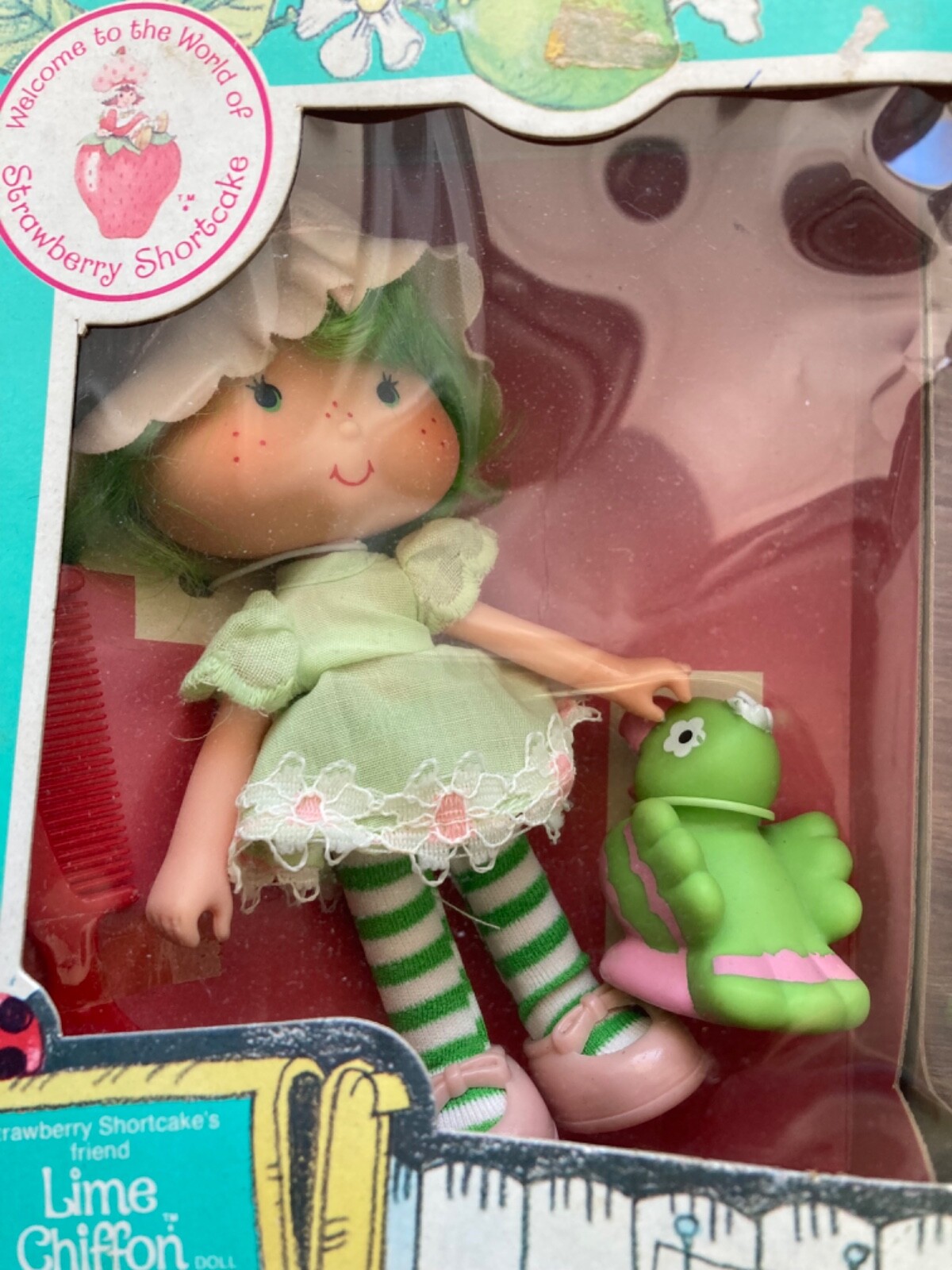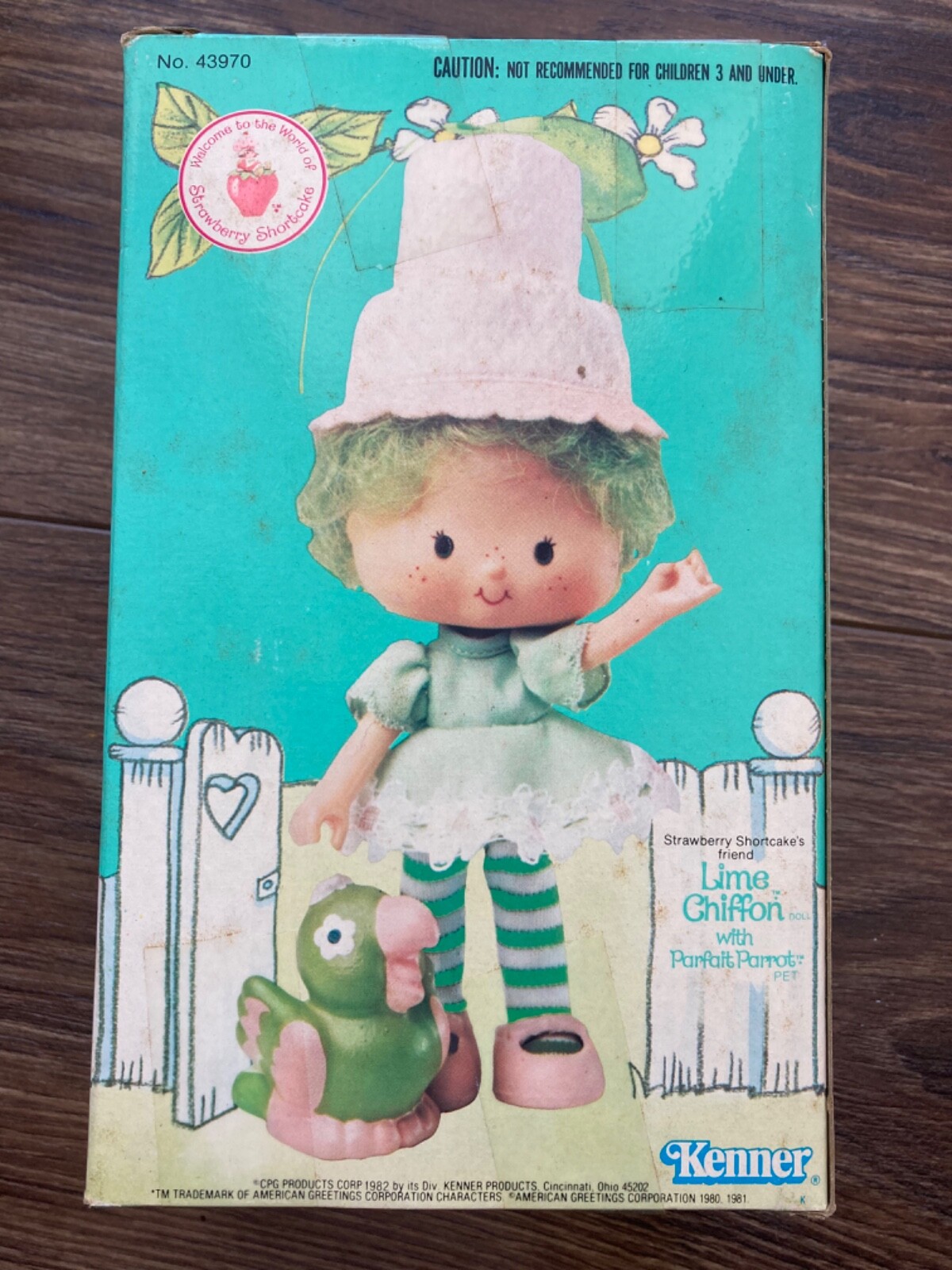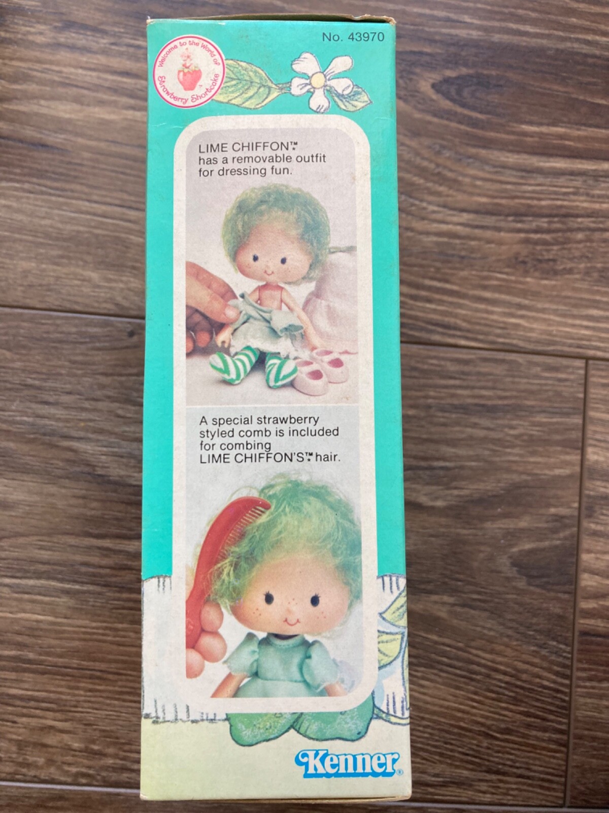 HOOKED-ON-VINTAGE IS SO PLEASED TO OFFER THIS ORIGINAL VTG 1980s Kenner Strawberry Shortcake Lime Chiffon Doll & Parfait Parrot TOY BOX ESTATE BOUGHT, NEW / UNUSED, 45 YEARS OLDS NOS NEW OLD STOCK. THE BOX HAS FADED BY AGE - SOLD AS SHOWN IN THE SUPER-SIZED PHOTOS. WE HAVE LOADS OF FUN VINTAGE VINYL RECORDS, VINTAGE GOODIES, AND ANTIQUE ITEMS FOR SALE IN OUR EBAY STORE AS WELL. WE LOVE TO COMBINED SHIPPING TO SAVE OUR EBAY CUSTOMERS MONEY = LIFE IS SHORT ... SO, BUY ALL YOU WANT! REAL RARE, REAL VINTAGE! READY TO ENJOY! COMES FROM A NON-SMOKING HOME. WE DO COMBINED SHIPPING TO SAVE YOU MONEY. CHECK OUR POSITIVE FEEDBACKS AND BID WITH CONFIDENCE! WE CAN COMBINED SHIPPING TO SAVE YOU MONEY, SO BID ON AS MANY AS YOU WOULD LIKE FOR YOUR COLLECTION.