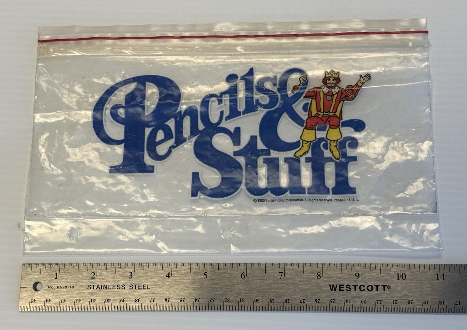 This vintage Burger King bag from 1980 is a must-have for any collector of advertising memorabilia. The bag features the Burger King logo and the words "Pencils & Stuff" written in bold lettering. It's a unique piece that would make a great addition to any collection or display. The bag is in good condition and has been well preserved over the years. It's made of durable material and is spacious enough to hold a variety of items. Whether you're a fan of Burger King or just love collecting vintage advertising items, this bag is sure to impress.