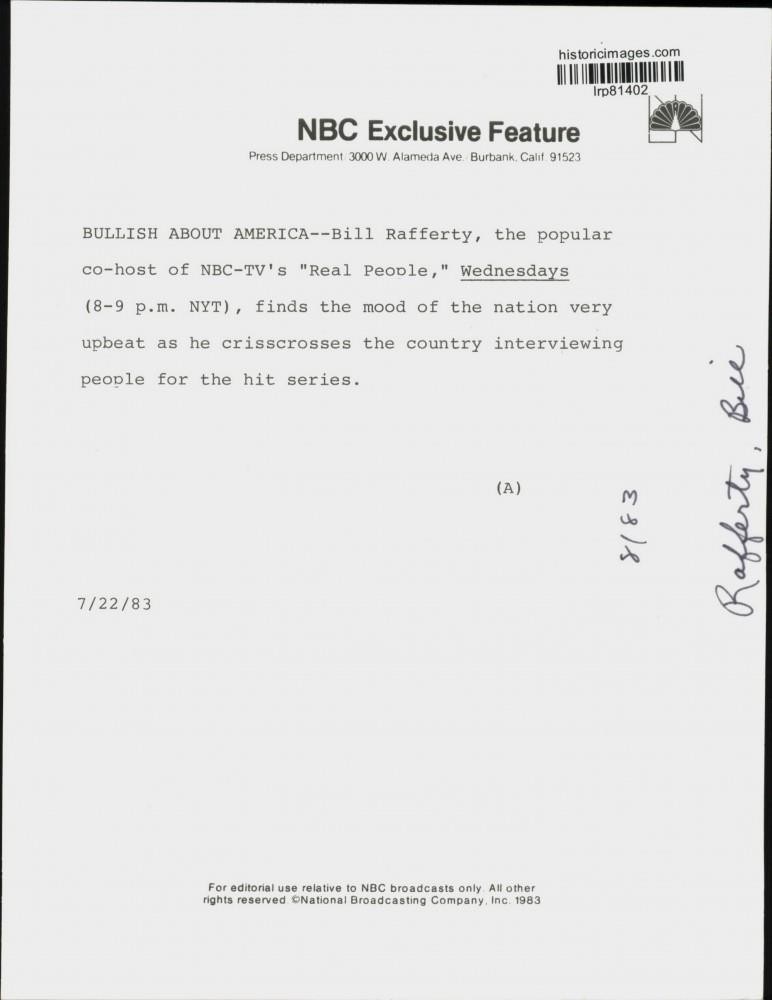 ebay template Note: Please study the images carefully to determine the condition of this vintage photograph, as it may not be in perfect condition. It may contain wrinkles, cracks, and possibly even tears due to its age and how it was handled before it got to us. A scanner may interpret colors and contrast differently than human eyes will, so it is possible that the actual photograph may be slightly darker or lighter in person. This vintage photograph is offered for sale as a collectible item and conveys no transfer of copyright. 1983 Press Photo Bill Rafferty, Co-Host of "Real People" TV Show - lrp81402 This is an original press photo. Bullish About America—Bill Rafferty, the popular co-host of NBC-TV's "Real People," Wednesdays (8-9 p.m. NYT), finds the mood of the nation very upbeat as he crisscrosses the country interviewing people for the hit series.Photo measures 7 x 9.25inches. Photo is dated 07-22-1983. PHOTO FRONT PHOTO BACK Historic Images Part Number: lrp81402 FAQs Q: Can I just download a digital version instead? A: No, we sell only vintage originals and do not make or distribute any copies, including digital ones. Q: Do you combine shipping and invoices? A: Multiple photos won on the same seller ID combine automatically through the eBay checkout process. If you encounter problems with this, send us a message via eBay messaging and we will send you an invoice. Due to eBay limitations, we cannot combine items won on our different seller IDs for a single shipping charge. Q: How quickly do you ship the items once paid? A: We ship within one business day after your payment clears. If you do not receive an "order shipped" email from us by the close of the second business day from submitting payment, please e-mail us via eBay messaging. Q: How do you make sure my photograph arrives safely? A: We package each order between two cross-corrugated pieces of cardboard to ensure that the package is as difficult to bend as possible. We then wrap each order in a plastic sheet to help protect against moisture. We want you to rest assured that we take every precaution to ensure that the photograph you receive will be in the same condition in your care as it was in ours. Q: Will the "Historic Images" watermark be on my photo when I receive it? A: No. This is a digital watermark we use to protect our images. It is not printed on the photo. Q: What are your office hours? A: eBay for us is a business, and a very fun one to be in! We are open M-F 9 to 5 (CST). Therefore, we do not return e-mails and phone calls over the weekend. We observe the following holidays: New Years Day, Memorial Day, Fourth of July, Labor Day, Thanksgiving and the day after Thanksgiving, Christmas Eve and Christmas Day. Q: Where did all these vintage photos come from? A: These original vintage photographs are from various news service and newspaper photo archives from locations around the country including: Boston, Detroit, Tampa, Chicago, Denver, Seattle, New Orleans, Milwaukee, Portland, Spokane, and more. We do not copy or reproduce any photographs -- every item is a unique vintage piece that was housed in a news archive. Q: Can I use this photograph in my book/blog/website? A: The short answer is no. There is no transfer of copyright for republication or reproduction with these photographs when you purchase them, and only photographs taken before 1923 are currently automatically in the public domain. Permission from the copyright holder, which usually can be identified from the back of each photo, must be sought to republish or reproduce the image for any purpose. Q: Do you relist items (in case I miss an auction ending)? A: Auction items that receive no bids are relisted in our store (historicimages-store on eBay) as a fixed-price item and at a higher price than the starting auction price. Q: Do you leave feedback? A: Yes, we always leave feedback for buyers. Our software monitors when our buyers leave us feedback, then notifies us that we can leave feedback for the buyer. Rest assured, if you leave feedback, we will do the same! Check out our family of eBay IDs: historicimages01 Sports Photos historicimages02 Entertainment Photos historicimages03 Americana Photos historicimages04 International & War Photos historicimages05 Transportation Photos historicimages06 Photos of All Subjects historicimages07 Entertainment Photos historicimages08 Newsworthy Photos historicimages09 Entertainment Photos historicimages10 Sports Photos historicimages-store Our largest fixed-price selection historicimages-gallery Hand-picked photos Saturday night auctions About Us Historic Images was formed in September 2009, with a handful of scanners working out of a basement to digitize newspaper photo archives. We have since moved out of the basement, and we can now archive thousands of photos per day. Our company has worked with magazines and newspapers from Detroit, Boston, Denver, Seattle, Tampa, Chicago, and New Orleans, just to name a few. We are constantly adding to our inventory, and have assembled an archive of millions of photos to date. As our company evolved, we began our eBay business, which brings thousands of fresh auctions per week to the world's largest online auction marketplace. Our custom software systems and team of great employees allow us to efficiently scan and sell large photo archives online. At the very core of our company's DNA is a strong commitment to customer satisfaction and strict integrity for our product. Our promise to you is that we will do everything in our power to provide you a great buying experience. Copyright 2009 - Present, Historic Images, Inc. Sell Smarter with Kyozou. Inventory and Ecommerce Management