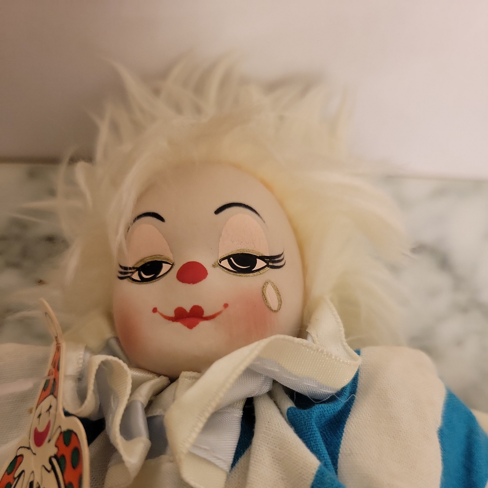 The 1987 Vintage Q-Tee-Clown Doll is a set of 2 small, gender-neutral clown dolls filled with sand. These antique dolls feature white hair, straight hair, black eyes, and a light complexion. Made of cloth and fabric, these collector toys are original and from the 1980s. Packaged without packaging, these vintage dolls are a unique addition to any doll collection. Standing at 7 inches tall, these Q-Tee clown dolls are a nostalgic piece of nostalgia for collectors of vintage dolls and toys. pet and smoke free house brand new condition set of two original tags still intact