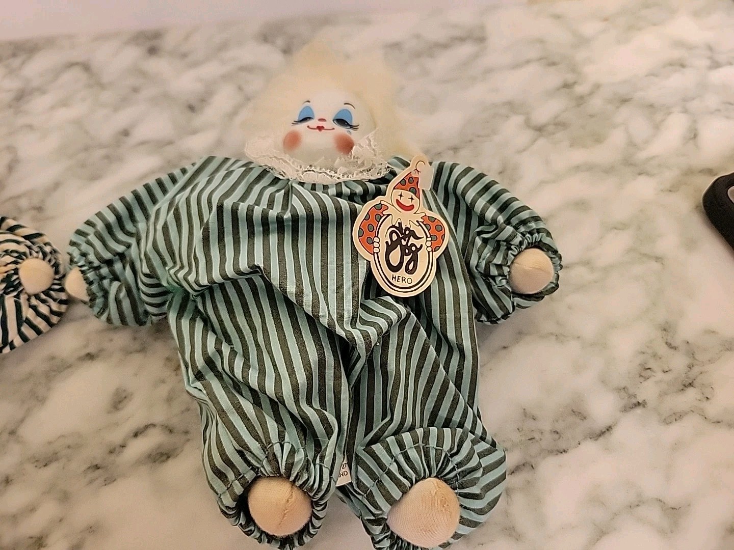 The 1987 Vintage Q-Tee-Clown Doll is a set of 2 small, gender-neutral clown dolls filled with sand. These antique dolls feature white hair, straight hair, blue eyes, and a light complexion. Made of cloth and fabric, these collector toys are original and from the 1980s. Packaged without packaging, these vintage dolls are a unique addition to any doll collection. Standing at 7 inches tall, these Q-Tee clown dolls are a nostalgic piece of nostalgia for collectors of vintage dolls and toys. pet and smoke free house brand new condition set of two original tags still intact