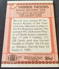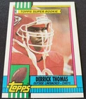 This 1990 Derrick Thomas Rookie Kansas City Chiefs Topps NFL Card #248 NCAA Alabama is the exact item you will receive and has been certified Authentic by REM Fine Collectibles. Derrick Vincent Thomas (January 1, 1967 – February 8, 2000), nicknamed "D. T.", was an American football linebacker for the Kansas City Chiefs of the National Football League (NFL). Considered one of the greatest pass rushers of all time, he played 11 seasons with the Chiefs until his death in 2000. Thomas played college football for the Alabama Crimson Tide, where he won the Butkus Award, and was selected fourth overall by Kansas City in the 1989 NFL draft. During his career, he received nine Pro Bowl and two first-team All-Pro selections, and set the single-game sacks record.Alongside Cornelius Bennett and later Keith McCants at Alabama, Thomas spearheaded one of the best defensive lines in college football and smashed many Crimson Tide defensive records, including sacks in a single season. He was awarded the Butkus Award in 1988. He was also selected as a consensus All-American at the conclusion of the 1988 season, a season which culminated in the Crimson Tide's thrilling 29-28 victory over Army in the 1988 Sun Bowl. In 2000, Thomas was named a Sun Bowl Legend. He was awarded the Sington Soaring Spirit Award by the Lakeshore Foundation. This annual award is named for University of Alabama football legend Fred Sington. Thomas was posthumously inducted to the College Football Hall of Fame in 2014. Thomas was selected fourth overall in the first round of the 1989 NFL draft by the Kansas City Chiefs. He was the first selection made by new head coach Marty Schottenheimer. Thomas would record his first career sack in the Chiefs week 2 game against the Los Angeles Raiders. That game was also his first multi-sack game as he finished with 2.5 sacks. He would record another 7.5 sacks that season finishing with 10 his rookie year. He was named AP Defensive Rookie of the Year. He was also named to the Pro Bowl. In his second year, Thomas recorded at least a half of a sack in each of the Chiefs first 5 games. In the Chiefs week 10 game against the Seattle Seahawks, he broke Fred Dean's 7-year old record of sacks in a single game with 7 sacks. The quarterback he sacked in that game, Dave Krieg, would become his teammate 2 seasons later. However, on the game's final play, Thomas had a clear shot for an eighth sack, but missed it and the Seahawks would throw a game winning touchdown after the missed sack. He would later call that play the one play in his career he wished he could have a second chance at. He would finish the season with what would prove to be a career high 20 sacks, setting a franchise record that stood until it was broken by Justin Houston in 2014. He finished 2nd in defensive player of the year voting and was named 1st team All-Pro. The following season, he would record his first career touchdown on a 23-yard fumble return for a touchdown in the Chiefs week 11 game against the Los Angeles Rams. Thomas would record double digits sacks for each of the first four seasons in his career. In total, 7 of his 11 seasons in the NFL he recorded double digit sack totals. In the Chiefs 1999 season, Thomas recorded a career low for sacks with 7. He would also record his first career interception in the Chiefs week 8 win over the San Diego Chargers. He would record the final sack of his career in the Chiefs week 15 against the Pittsburgh Steelers. In what would be the final game of his career, as he would die 37 days later, the Chiefs played their rival the Oakland Raiders. With a victory in the game, the Chiefs would qualify for the playoffs. The Chiefs lost in overtime 41–38. He didn't manage to record a sack on his former teammate Rich Gannon, but he did record 6 total tackles. Thomas was named 1st team All-Pro 2 times and was named to the Pro Bowl 9 times. He is 17th all-time in sacks and at the time of his death in 2000, he was 9th all-time with 126.5. He remains the Chiefs' all-time leader in sacks, safeties, forced fumbles, and fumble recoveries. During his career, he recorded 1 interception and recovered 19 fumbles, returning them for 161 yards and 4 touchdowns. Thomas said in interviews his favorite quarterback to sack was Denver Broncos quarterback John Elway, whom he sacked 26 times. The sack total over Elway is most against any quarterback in Thomas' career and the most any individual player sacked Elway. He was posthumously inducted into the Chiefs Hall of Fame in 2000, with the Chiefs breaking the tradition of waiting four years after the end of the player's career. In 2009, he was posthumously inducted into the Pro Football Hall of Fame. Later that same year, the Chiefs retired the number 58 in honor of him. Following his death until it was officially retired, the Chiefs did not reissue the number. The Chiefs also named their player of the year award in Thomas' honor, an award he won twice himself prior to the award being named in his honor. He is the only NFL player to die during their career that was later inducted to the Hall of Fame.