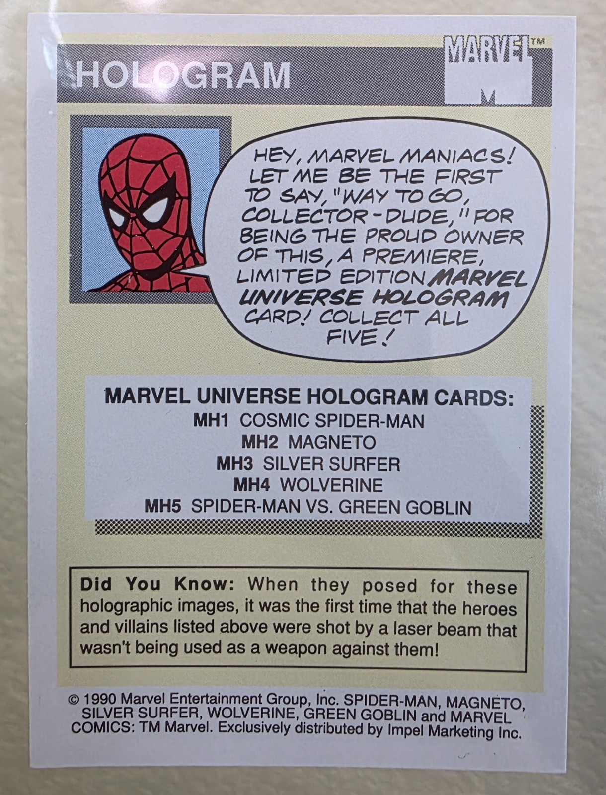1990 Marvel Universe Spider-Man vs Green Goblin Hologram Card #MH5. Rare Error. Note: Spider-Man's head on back of card, matches the same side as Green Goblin on front of card. (See Pictures) Card in Mint condition. No returns.