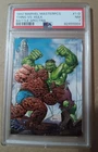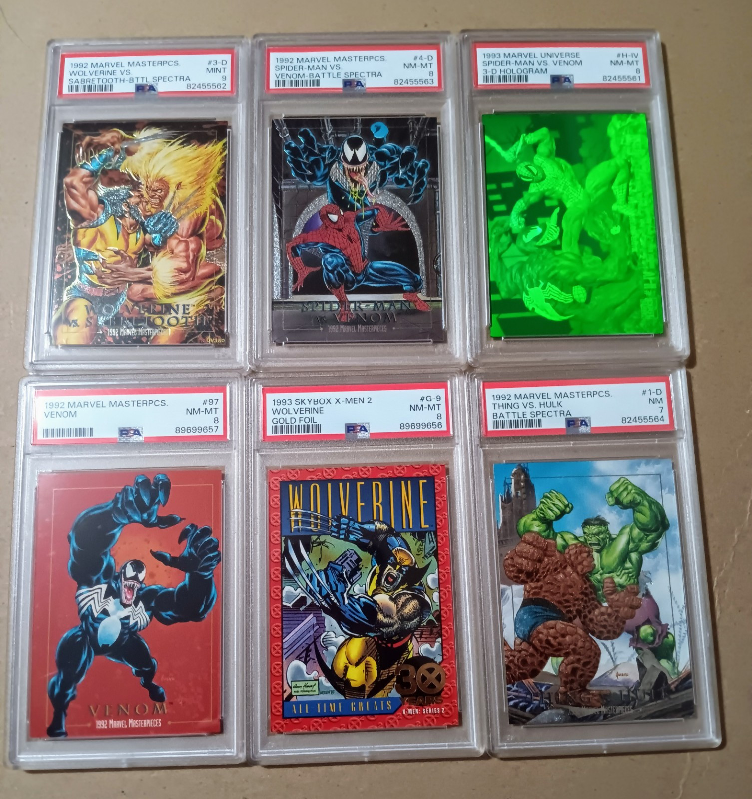 This listing is for a set of six Marvel trading cards from the 1992 Marvel Masterpieces and 1993 Marvel Universe series. The cards feature popular characters like Spider-Man, Wolverine, Sabretooth, Venom, and Hulk, illustrated by Joe Jusko. These vintage cards are printed on card stock and are graded a 7,8 and 9 by Professional Sports Authenticator (PSA). They are original prints from the Marvel franchise and are part of the base set.