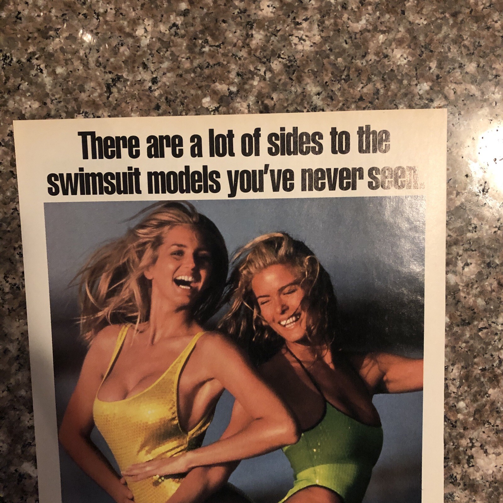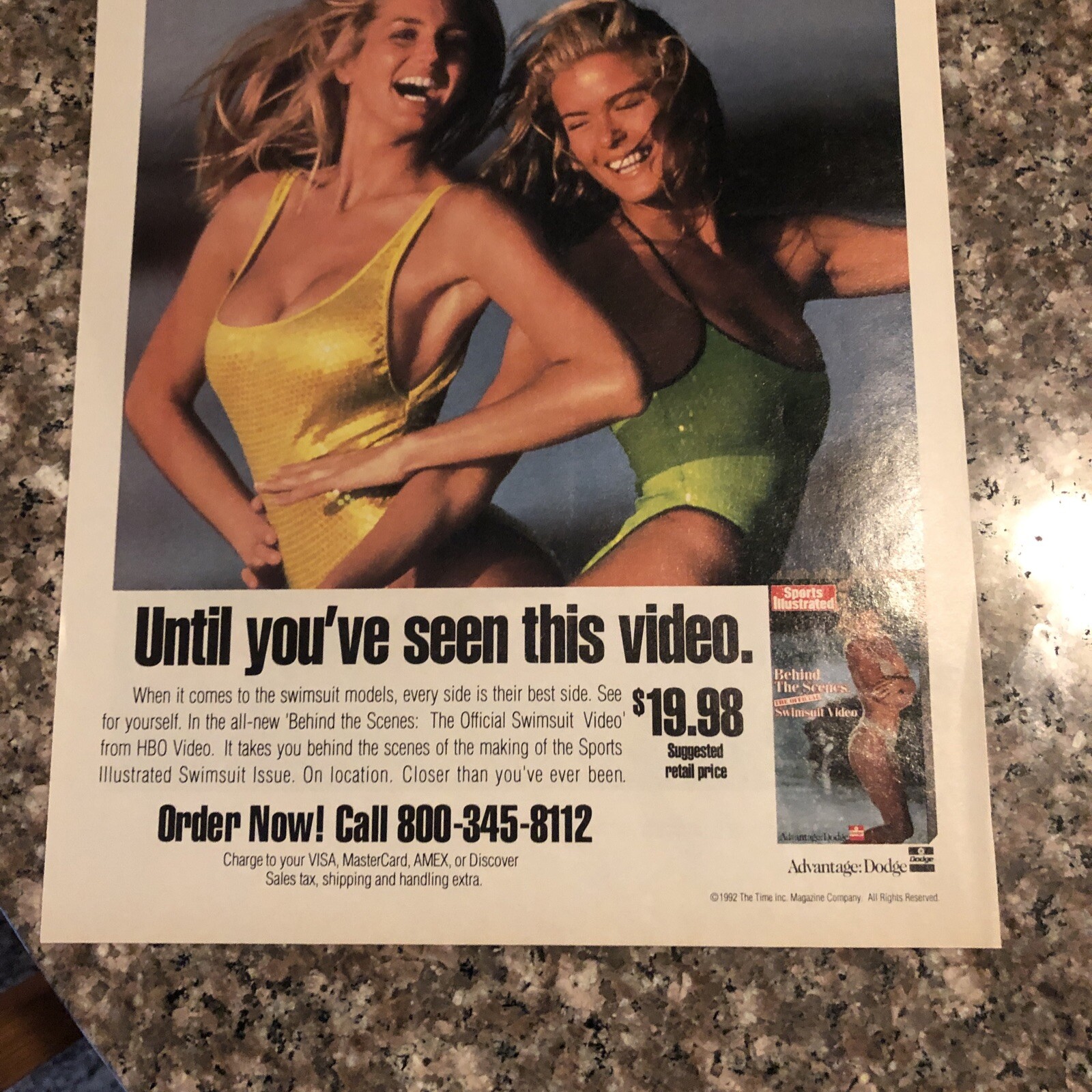 This original 1992 Sports Illustrated print ad showcases stunning swimsuit models in multi-color clothing. The advertisement promotes a VHS behind the scenes video, giving collectors a sneak peek into the world of Sports Illustrated's iconic swimsuit edition. The ad was created in the United States and is an original piece from the 1980-Now time period. It would be a perfect addition to any collection of advertising or clothing memorabilia. Original approximate 8"x11" vintage magazine print ad.