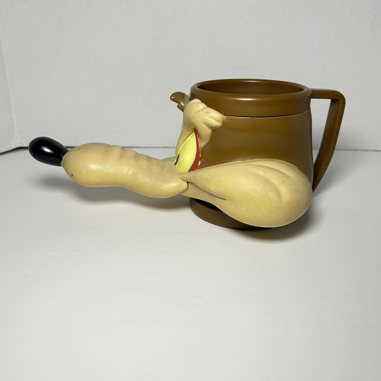 This is a vintage 1992 plastic mug/cup featuring the character Wile E. Coyote from the Warner Bros. Looney Tunes franchise. The mug is multicolored and part of the animation theme. It was manufactured in China and is related to the TV show "road runner." This collectible item is a piece of animation merchandise from the Looney Tunes series. Mug does have some marks around the cup mostly on his nose