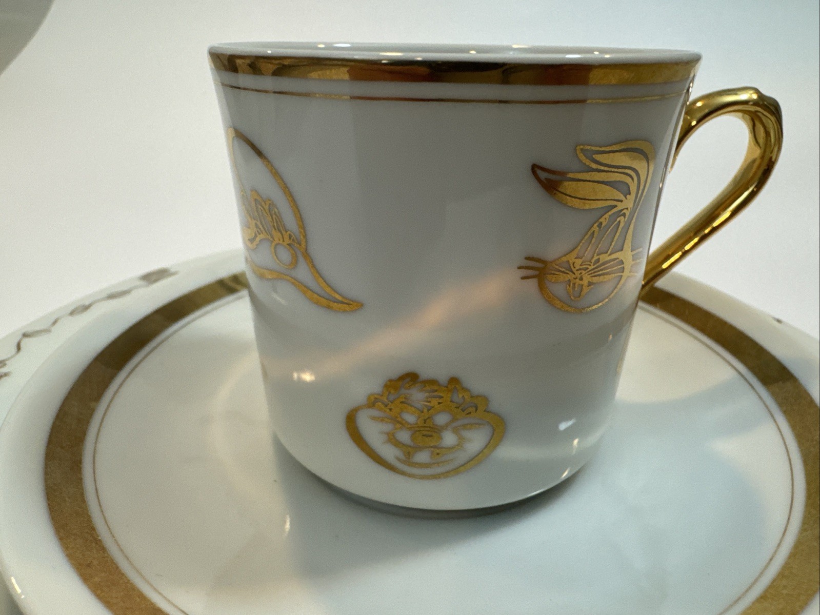 This product is a set of three ceramic collectibles featuring the Looney Tunes characters. The set includes a plate and two cups, all decorated with the Warner Bros. logo and various Looney Tunes characters. The items were manufactured in Thailand in 1994 and have gold trim. Pre-owned excellent condition. Never been used. No cracks or damages. No original box. Please check the pictures carefully as part of the description. Feel free to ask questions if you need more information before you buy it. Thank you for your interest J-5