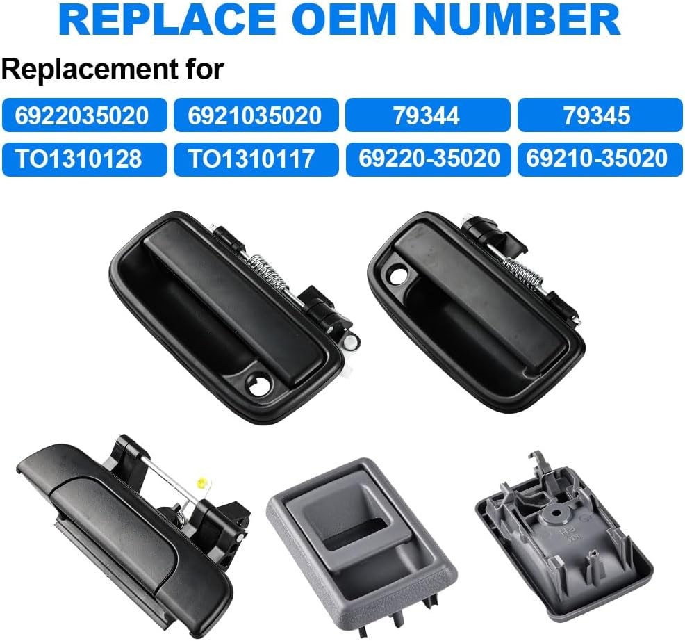 Free eBay listing template designed by dewiso.com JDMON Front Rear Left Right Exterior Door Handle Interior Door Handle Replacement for Toyota Tacoma 1995-2000 Outer Outside Inside Inner Handle Set Replacement for 69220-35020 69210-35020 6909035010 FREE AND FAST SHIPPING! About this item Fitment: JDMON Left driver & right passenger side exterior door handles & interior door handle & tailgate door handle replacement for Toyota Tacoma 1995 1996 1997 1998 1999 2000 2001 2002 2003 2004 Direct Replacement: LH & RH outside door handle set Replacement for 69210-35020, 69220-35020, TO1310117, TO1311117,79344, 6922035020, 69220-35070-C0,79345, 6921035020. LH & RH inside door handle set Replacement for 6920504010B1, 6920604010B1. Rear door handle Replacement for 69090-35010, 6909035010 Textured Appearance: The exterior door handles have a black smooth finish and interior door handles have a matte frosted finish, giving your car a new look while also being more scratch resistant and durable. By installing this door handle, you can save time and energy Robust Construction: JDMON Door handles are made of reinforced ABS material, increasing rigidity and touch feel. And They have undergone a rigorous endurance test which can last for long life spans Package Included: A set of outside door handles & a set of inside door handles & a tailgate door handle. The installation of auto parts requires professional knowledge and skills. We recommend that it be completed under the guidance of a professional mechanic Product We offer a 30-Day Return Policy on items which you are not completely satisfied with. You have the option for a full-refund or an exchange of the item. No returns are available on items shipped outside of the US . Shipping We offer Free Shipping to the US and ship within 2 business days of payment, usually sooner. We use UPS express shipping. That's why your products are usually delivered within 3 days . Contact We try our very best to make sure every customer is completely satisfied. If there's a problem , message us! We're happy to help. 24/7 live chat available.
