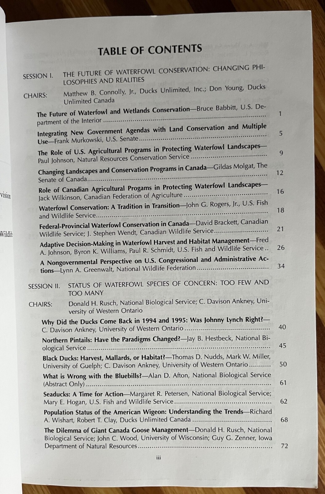 '"7th International Waterfowl Symposium" (Proceedings), Published Ducks Unlimited, 1996. Trade Paperback. 270 pages. Book is a compilation of papers from multiple contributing authors on topics ranging from management of wetlands, to snow goose abundance, to sea duck conservation, to harvest management. See pictures of table of contents. Many papers are difficult to find. Very nice condition If more than one book is published, I will combine into one shipment to reduce postage costs. Savings will be returned to the buyer.
