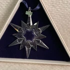 Add a touch of elegance to your Christmas tree with this limited edition 1997 Swarovski Annual Edition Christmas Holiday Snowflake Star Ornament. Designed by a contemporary artist, this crystal ornament features a beautiful snowflake pattern and is handmade in Austria. The ornament is medium-sized, measuring 3 inches in height and width, and weighs 2.8 ounces. This Swarovski ornament is a perfect addition to your ornament collection and is suitable for any occasion. The clear crystal material adds a sparkling touch to your tree and the attached items make it easy to hang on your tree. Get this original, artist-designed ornament now and add a touch of holiday magic to your home. Excellent condition. NOB
