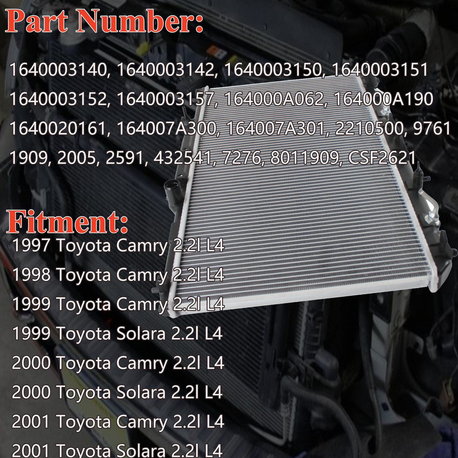 Store Home New Listing Ending Soon Sale items View Feedback Contact us Shock Absorbers & Spring Power Steering Pump Rack & Pinion Engine Rebuild Kit Store Categories Aluminum Radiator For 1997-2001 Toyota Camry 4-Door 2.2L l4 99-01 Toyota Solara Aluminum Radiator For 1997-2001 Toyota Camry 4-Door 2.2L l4 99-01 Toyota Solara Product Description 1pc Radiator For 1997-2001 Toyota Camry Solara 2.2L CU1909 Specifications Size: 84x12x60cm Weight: 10.08kg Material: Plastic&Aluminium Color: Silver Placement on Vehicle: Front Core Material: Aluminium Tank Material: Plastic Inlet Diameter: Φ31 Outlet Diameter: Φ31 CORE SIZE(mm): 400*728*16 Part Number: 1640003140, 1640003142, 1640003150, 1640003151, 1640003152, 1640003157, 164000A062, 164000A190, 1640020161, 164007A300, 164007A301, 1909, 2005, 2210500, 2591, 432541, 7276, 8011909, 9761, CSF2621 Other Part Number: CU1909 Fitment: For 1997 Toyota Camry 2.2l L4 For 1998 Toyota Camry 2.2l L4 For 1999 Toyota Camry 2.2l L4 For 1999 Toyota Solara 2.2l L4 For 2000 Toyota Camry 2.2l L4 For 2000 Toyota Solara 2.2l L4 For 2001 Toyota Camry 2.2l L4 For 2001 Toyota Solara 2.2l L4 Package Include: 1pc Radiator Features: 1. Built to strict quality control standards 100% factory tested 2. ISO9001/IATF 16949/EAC 3. Easy Installation,100% Compatible with OEM Parts, meets Original Equipment Manufacturer (OEM) Standards 4. Mechanically tested prior to leaving the factory ensures optimal performance and enhanced durability. 5. Perfect match for the original car. 6. The Core was made from high quality Aluminum.Effective heat dissipation. 7. Good sealing. 8. Direct Replacement, easy to be installed Attention: 1. The radiator cap that has not passed the test can’t release the pressure when it reaches the pressure value. 2. The damaged thermostat is unable to carry out a large cycle, resulting in a continuous increase in the radiator pressure. 3. The radiator fan does not turn, resulting in high temperature in the water tank. 4. Drain the air from the cooling system. Refer to the user manual or repair manual. 5. Please refer to owner's manual to add coolant. 6. Do not open the hood until the steam has subsided. The engine compartment may be very hot, causing serious injuries such as burns. 7. Please stop the vehicle immediately, when “ENGINE OVERHEAT/High Temperature” shows on the dashboard or steam comes out from under the hood. 8. Keep hands and clothing (especially a tie, a scarf) away from the fans and belts. Failure to do so may cause the hands or clothing to be caught, resulting in serious injuries. 9. Do not loosen the radiator cap while the engine and radiator are hot. Serious injuries, such as burns, may result from hot coolant and steam released under pressure. Note: 1.It will be better if you can check with that above chart to make sure if this radiator will fit your vehicle. 2. The radiator cap that has not passed the test can't release the pressure when it reach the pressure value. 3. The damaged thermostat is unable to carry out a large cycle, resulting in a continuous increase in the radiator pressure. 4. The radiator fan does nont turm, resulting in highh temperature in the water tank. 5. After loading the product on your vehicle and adding the coolant, tighten the rotary cover and leave your vehicle idling for 10-20 minutes. After completely cooling the coolant, open the cover and fill the product with coolant. Please make sure there is no gas in the product. 6. Before you start up your vehicle, please make sure there is coolant in the radiator. About Us Payment Shipping Returns Contact Us About Us VEHICULOS Story: Mission: The mission of VEHICULOS automotive parts is to provide customers with excellent quality and reliability, ensuring their vehicles are always in optimal condition. We aim to be the preferred brand in the field of car maintenance and repair, offering unmatched value and trust to our customers. Philosophy: At VEHICULOS, we believe that every single automotive part plays a crucial role, influencing the overall performance and safety of the vehicle. Therefore, we strive for the perfect combination of exceptional quality, innovative technology, and superior service to meet the demand for high-standard automotive parts. Founder's Experience: The founder of VEHICULOS automotive parts, Cooper, is an automotive engineer and an expert passionate about car maintenance. He held key positions in renowned car manufacturers and aftermarket companies, accumulating extensive industry experience. However, he recognized the varying quality of automotive parts available in the market and was determined to create the VEHICULOS brand, offering reliable and high-quality parts to provide customers with worry-free maintenance and repair experiences. "Excellence in Quality, Confidence in Every Drive" - VEHICULOS Automotive Parts, infusing your vehicle with reliable power! VEHICULOS automotive parts stand out in a highly competitive market due to the following differentiating factors : 1,Superior Quality: VEHICULOS strictly controls every production process to ensure all parts meet the highest quality standards. We utilize premium materials and advanced manufacturing techniques, subjecting each component to rigorous testing and validation for durability, performance, and safety. 2,Innovative Technology: VEHICULOS continuously introduces innovative technologies, incorporating the latest advancements into the design and manufacturing of our parts. We strive to deliver products with outstanding performance and advanced features, meeting customers' expectations for enhanced vehicle performance and driving experience. 3,Customer Care: We understand the importance of customer satisfaction in vehicle maintenance and repair. Therefore, VEHICULOS always prioritizes customer needs. We provide professional pre-sales consultation and after-sales services, assisting customers in selecting the right parts for their vehicles and offering installation and maintenance gui