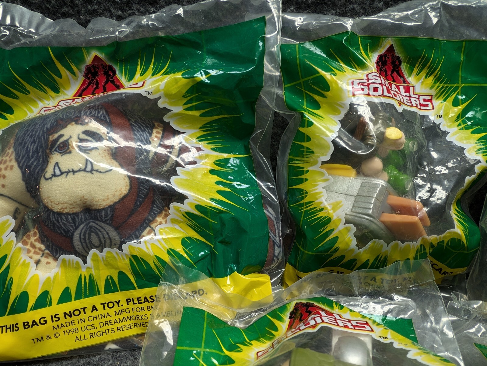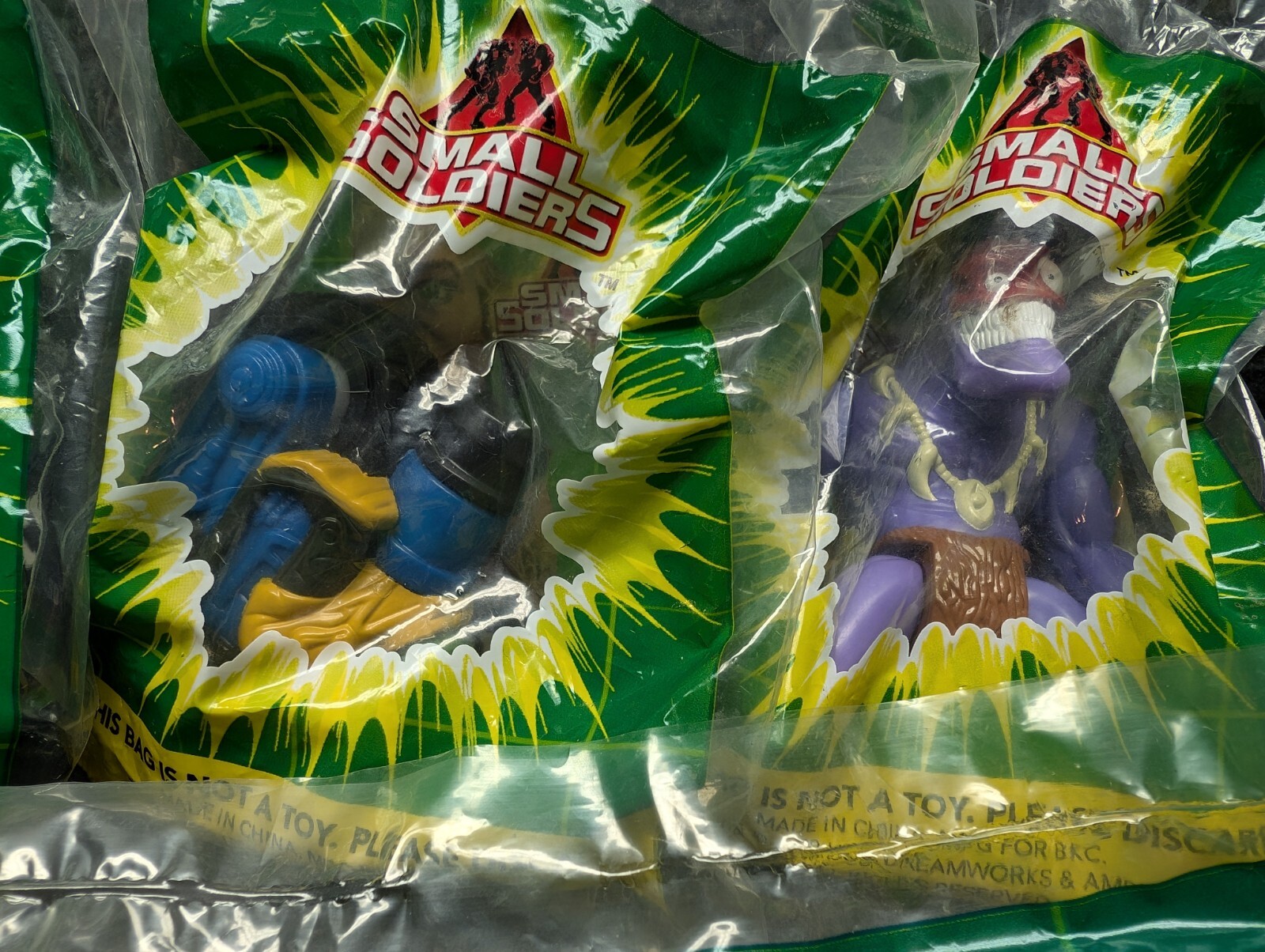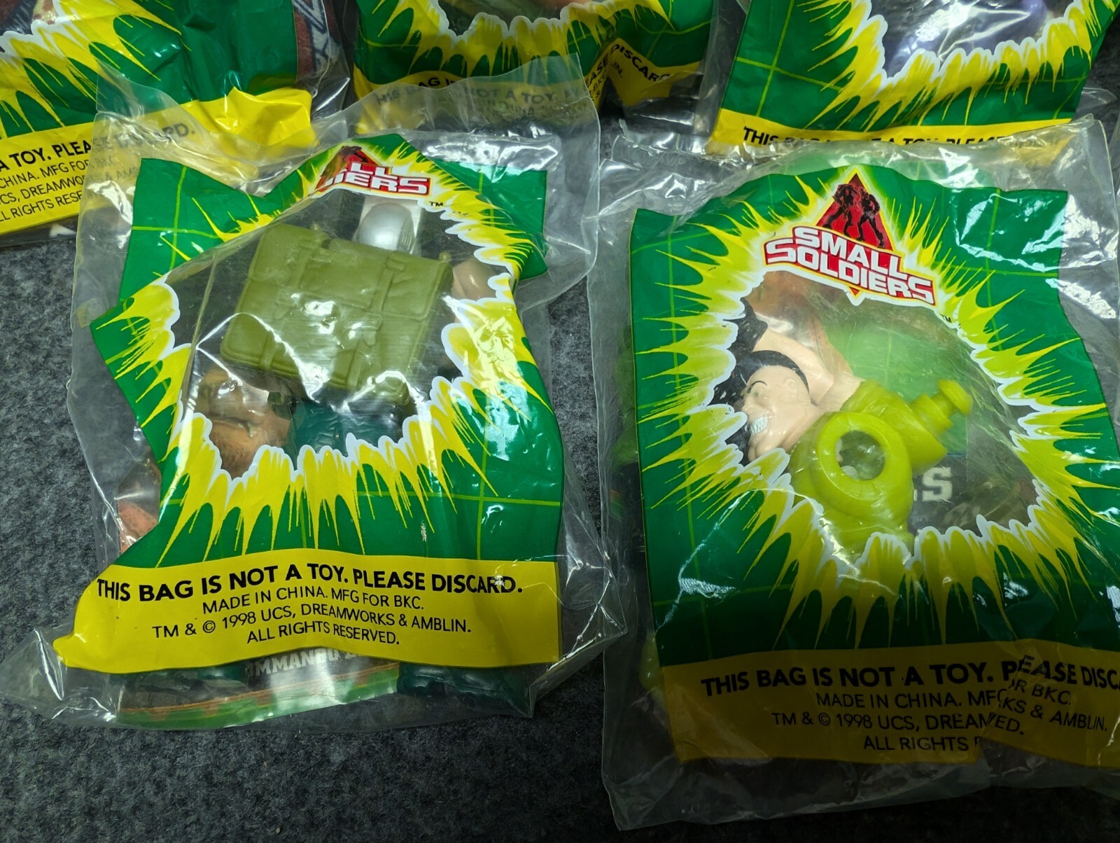 The 1998 Small Soldiers Burger King Kids Toys consist of a set of 10 toys, with 5 representing the commando faction and the other 5 representing the gorgonites faction from the "Small Soldiers" character family. These toys were part of a promotional campaign by Burger King during that year. The toys would have been designed to appeal to children and fans of the Small Soldiers franchise, providing them with collectible items to enjoy.