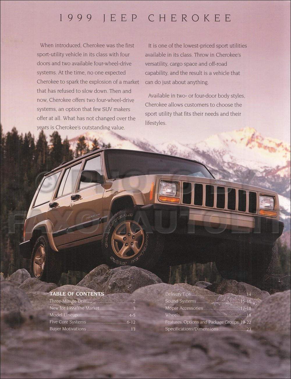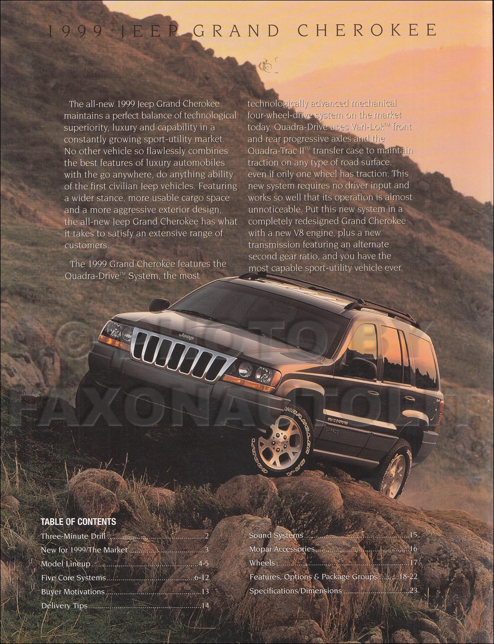 Item Description This is a dealer-only album that salespeople used. It was written by Jeep to train salespeople to sell vehicles to customers. For each model, the book: (1) explains which features are new for 1999, (2) identifies target types of customers by age, income, and more, (3) explains reasons for buying based on research, (4) lists features to point out when walking around the vehicle, (4) lists option packages and shows pictures and descriptions of accessories, and (5) includes detailed lists of standard and optional equipment, (6) lists specifications, and (7) compares Jeeps to specific competitors. Buy now to own this rare original book straight from the showroom. Item Specifications Exact Title: "1999 Jeep Sales Consultant Product Guide" Authenticity: This item is original. Dimensions: 11.75 x 11.50 x 3.50 OEM Part Number: none Pay Media Mail shipping on 1 item, get FREE US shipping on 2nd item if shipped together. Find more in our store Click here for more 1999 Jeep Grand Cherokee manuals. Click here for more 1999 Jeep Cherokee manuals. Click here for more 1999 Jeep Wrangler manuals. Model-Year Application 1999 Jeep Cherokee Limited Sport Utility 4-Door 1999 Jeep Cherokee SE Sport Utility 4-Door 1999 Jeep Cherokee Sport Sport Utility 4-Door 1999 Jeep Grand Cherokee Limited Sport Utility 4-Door 1999 Jeep Wrangler SE Sport Utility 2-Door 1999 Jeep Cherokee Classic Sport Utility 4-Door 1999 Jeep Cherokee SE Sport Utility 2-Door 1999 Jeep Cherokee Sport Sport Utility 2-Door 1999 Jeep Grand Cherokee Laredo Sport Utility 4-Door 1999 Jeep Wrangler Sahara Sport Utility 2-Door 1999 Jeep Wrangler Sport Sport Utility 2-Door Shipping Policies Shipping U.S. Super saver postal media mail with delivery confirmation is the lowest-priced option. Media mail typically takes 7-14 business days to arrive in the continental US.. To AK, HI, PR, and APO, media mail takes a month so we recommend priority mail instead. Optionally, get this item sent to the US via postal Priority Mail with delivery confirmation for an additional cost (see details by shipping price). Please request a quote for combined Priority Mail shipping, since multiple items may require extra shipping costs. Shipping Overseas Economy shipping does NOT include tracking. Standard shipping usually includes tracking. International shipments typically take 1-3 weeks for delivery, but can take longer. Please supply a phone number with your order to ensure timely delivery of your package. Shipping Canada Shipment to Canada includes tracking. Shipment to Canada typically takes 2 weeks for delivery. Hours Open 7:30 am to 4:30 pm pacific time weekdays. Closed Saturdays, Sundays and holidays. Finally, Buy With No Risk from the Auto Literature Experts Pledge of Honesty We are a high tech company with old-fashioned integrity. Our Promise of Value: When you buy from Faxon, you know that the book you get will cover the years and content listed in the long description. We got to be the largest sellers of out of print auto books by becoming the experts on what you need to get your project on the road. Our Assurance of Security: We have never sold or shared a phone number, email address, or street address. We have never had a credit card number stolen. Your personal information is safe with us. Backed by More than Forty Years of Professional Experience: For more than forty years, we have been researching auto literature. We have built a library of rare manuals and compiled lists of manuals that exist. No other company has invested so much time and effort to find the best book for your vehicle. We buy from every major printer in the US in order to offer you the finest quality books and the best selection anywhere. Powered by SixBit's eCommerce Solution