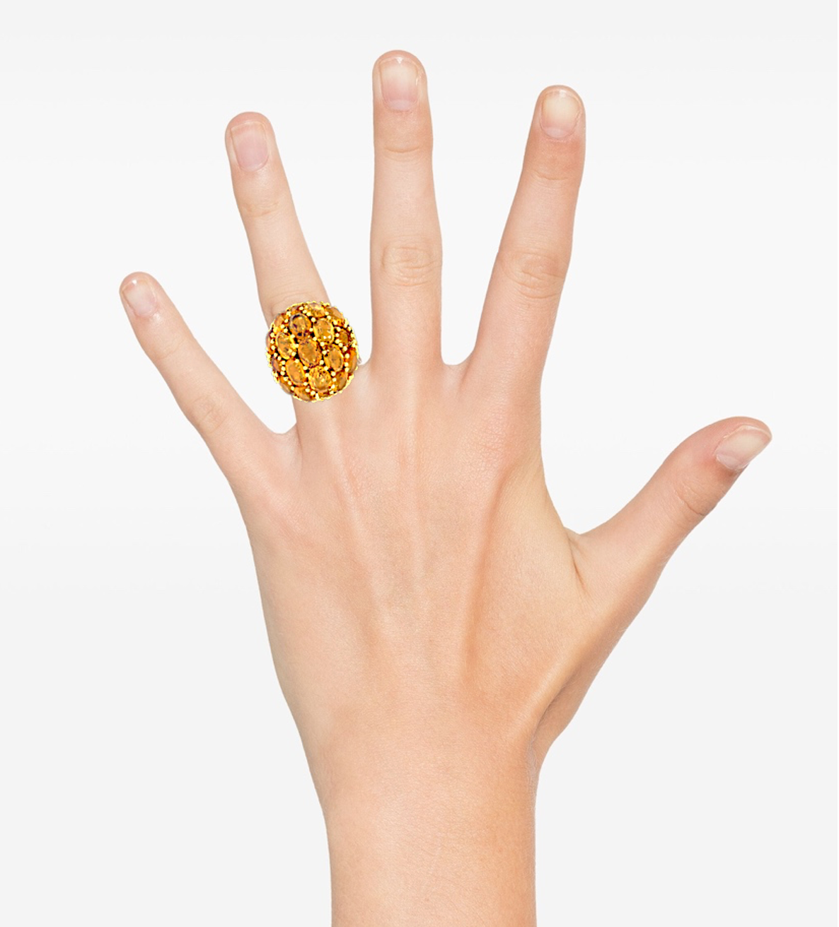 Beautiful Oval & Round Citrine Large Dome Cluster Cocktail Ring in 18K Yellow Gold This item is Handmade, one of a kind. Total Carats: 19.0ctw Material: 18K Solid Yellow Gold Ring Weight: 14.0 Grams Stone 1 - Number of Stones: 17 Natural Genuine Citrine: Total Carat Weight: 14.50ctw - Oval Cut - Prong Set - Golden Orange Color Stone 2 - Number of Stones: 20 Natural Genuine Citrine: - Total Carat Weight: 4.50ctw (approx.) - Round Cut - Prong Set - Golden Orange Color Ring Size: 7.0 Ring Width: 24mm Ring Height: 17mm rise off the finger Handmade, one of a kind. Condition: Excellent Condition