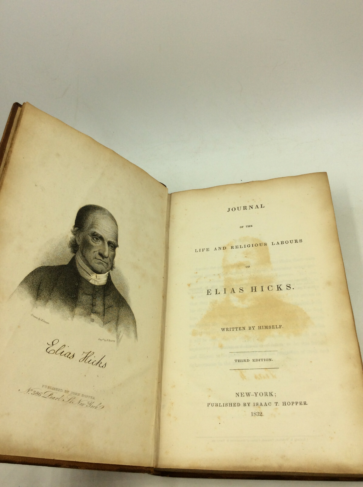 Elias Hicks JOURNAL OF THE LIFE AND RELIGIOUS LABOUR OF ELIAS HICKS. Written by Himself. New York: Isaac T. Hopper, 1832. Third Edition. Leather. 451p. A hardcover book bound in full brown leather. Very good condition overall. Edges scuffed, and a deep rub mark at the top of the front cover. Old pencil marks on front endpapers. Foxing throughout, but otherwise, text unmarked and binding secure. Item #177593 The autobiography of Quaker minister Elias Hicks (1748-1830), whose teachings caused a schism that resulted in the Keithian sect of Friends.