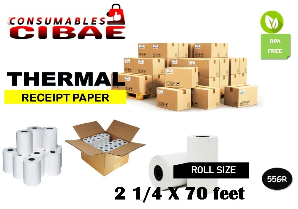 2 1/4" x 70' thermal paper rolls are quality manufactured for long-lasting readability and are compatible with a wide range of printing devices and credit card terminals. Each roll has a vibrant white background for easy reading of the text and is tightly wound and precisely cut for smooth feeding that prevents jamming. The End of Roll Warning Indicator lets you know when it's time to change your printer's roll. Printer rolls are sold in boxes of 200und, 100und, 50und, are BPA-free, and meet OEM printhead requirements. Product Specifications 2.25" x 70' thermal paper rolls 2.25" (57 mm) wide 1 1/4" (40 mm) diameter Core size = 1/2" Write to us if you have any questions about printer compatibility!