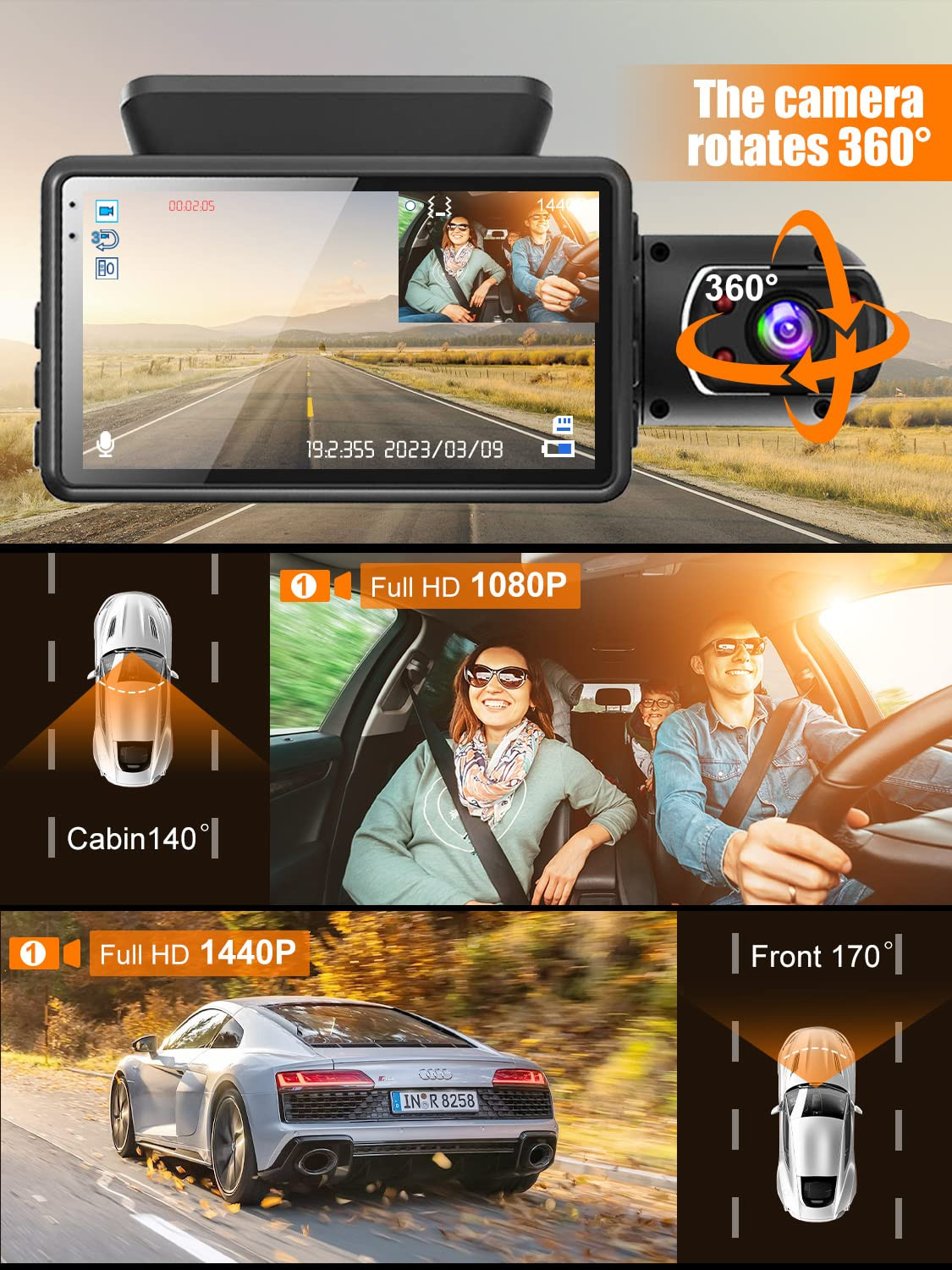 【2 Channel 360° Rotating Dash Cams】- The 2 channel dash cam is designed to simultaneously monitor both the front and interior of your vehicle with audio features at 1440 Front Car Camera+ 1080P Cabin 360° Camera. With its switchable 360° Rotating lens, this dashboard camera can be utilized to record cabin, right side, or both, making it a versatile 2 channel dash cam perfect for capturing every angle of your driving activities 【Built-in 2.4G WiFi & APP Control】- This delicated car camera comes with APP for Android or iOS smartphones to get a live stream, download videos, change settings, edit and share your footage simple. Footages can be shared easily to YouTube, Twitter, Facebook, or the social media platform with the tap of a finger, allowing you to share any journey with all of your friends 【6 Infrared Night Vision for Safety】- Stay safe on the road with this 2-way dash cam. Equipped with high-performance Advanced Sensor and 6 IR LED lights, it captures clear and balanced video even in low-light. Use it as a dual dash cam to record both front and rear views simultaneously for complete coverage and protection. Get this reliable dash camera today and enjoy peace of mind while driving 【Easy Install / 32G SD Card】- Our dash camera makes installation a breeze. With all necessary accessories included, simply install the 3M tap onto your windshield and start recording. Includes a 32G high-speed SD card and reader, so no additional purchases are needed. Perfect for cars with the plug n play feature, simply insert the SD card and connect to power. Get crystal clear footage on the go with our mirror dash cam 【Loop Recording & Emergency Locks】- Never miss a moment with our dual dash cam. Featuring loop recording, it will automatically erase the oldest unlocked footage when storage reaches capacity. And with emergency accident locks, the built-in G-sensor will detect collisions and lock the current recording for evidence. Ideal for capturing both front and rear inside the car, this dash cam front and rear is a must-have. Never compromise on safety with our reliable dashcam