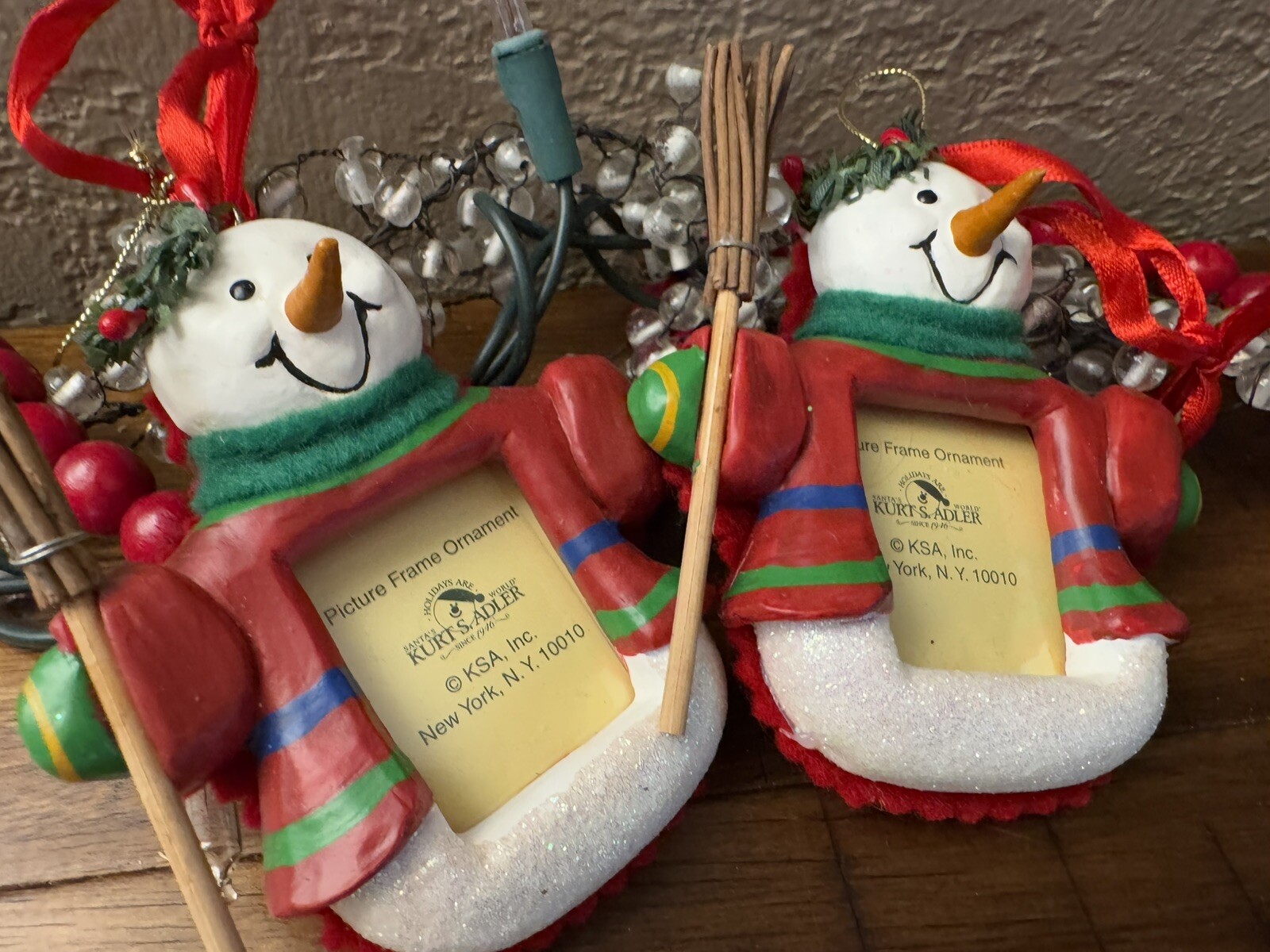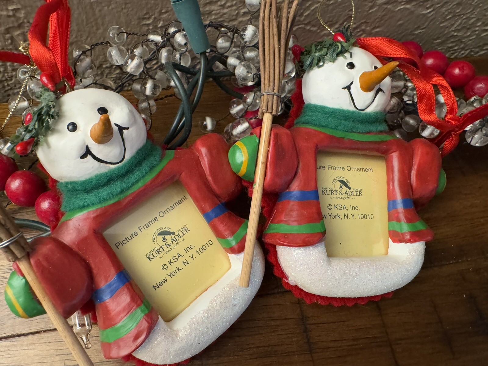 TWO ORNAMENTS This product is a set of two vintage Kurt Adler snowman photo frame ornaments. Each ornament features a snowman holding a broom and adorned with holly and glitter details. The ornaments are made of resin and have a photo holder feature, making them perfect for displaying cherished memories during the Christmas season. These ornaments are part of the Christmas theme collection by Kurt Adler and would make a festive addition to any holiday decor. Please see all photos SMOKE FREE HOME Always happy to combine for shipping savings Please buy through your cart on multiple items and request a combined shipping invoice If you pay separately, no worries, I just send the refund when I create the label