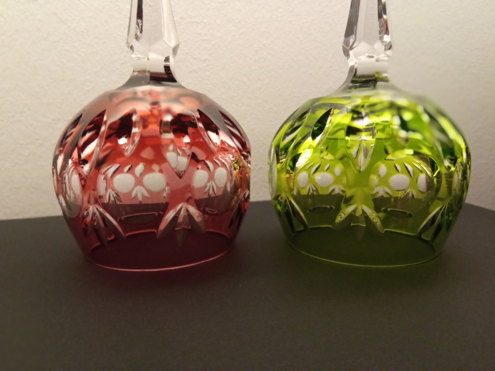 The product is a set of 2 Nachtmann Bamberg 7 7/8" hock wine glasses in red and rezeda colors. These vintage wine glasses feature a curved bowl shape with the Bamberg pattern, making them a stylish and unique addition to any glassware collection. Made of crystal, these wine glasses are perfect for serving and enjoying wine in an elegant and sophisticated manner.