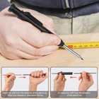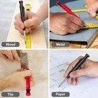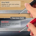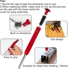 Long Nib and Deep Hole Marker Our mechanical carpenter pencil features a 45mm nib, designed for easy marking in deep holes and narrow spaces. This construction pencil is ideal for woodworking, carpentry, and architectural projects. Versatile Marking with Extra Refills Included are 12 extra 2.8mm refills—6 red and 6 black—allowing for versatile marking. Use the black refills on light surfaces and the red wax on darker materials. You'll always have a sufficient supply for extended use. Built-in Sharpener Equipped with a built-in sharpener, this construction pencil ensures that the tip stays sharp and ready for action. There's no need for a separate sharpener, making it an essential tool for woodworkers and contractors. The mechanical mechanism allows for easy extension or retraction of the refill, enhancing your efficiency and accuracy. Portable Clip Design The pencil features a convenient clip for easy attachment to your pocket or toolbox, keeping it close at hand for on-the-go use. It makes a great gift for carpenters and tradespeople alike. Stronger Pencil Lead Our black refills are made from sturdy lead, while the red refills consist of clear, lightweight wax. These marking pencils are thicker and more robust than standard options, suitable for a variety of surfaces including glass, metal, wood, and more. Marks can be easily wiped away with a wet paper