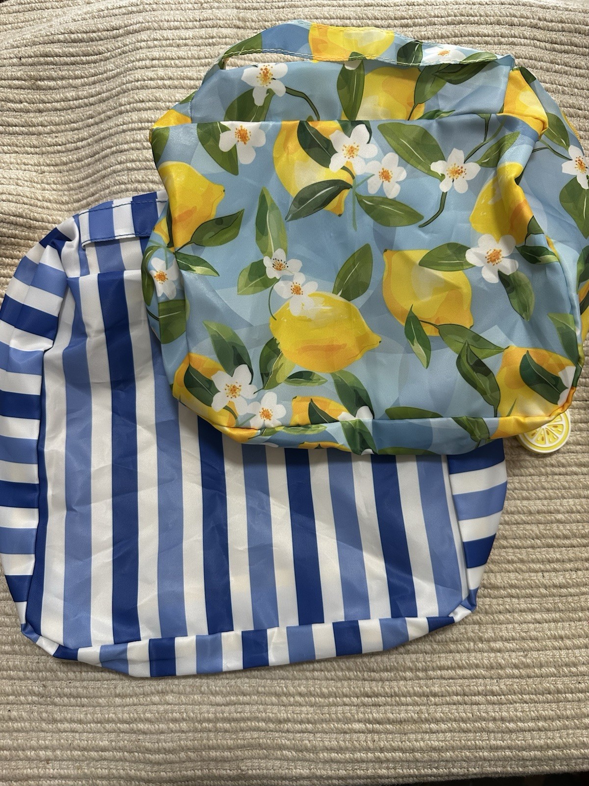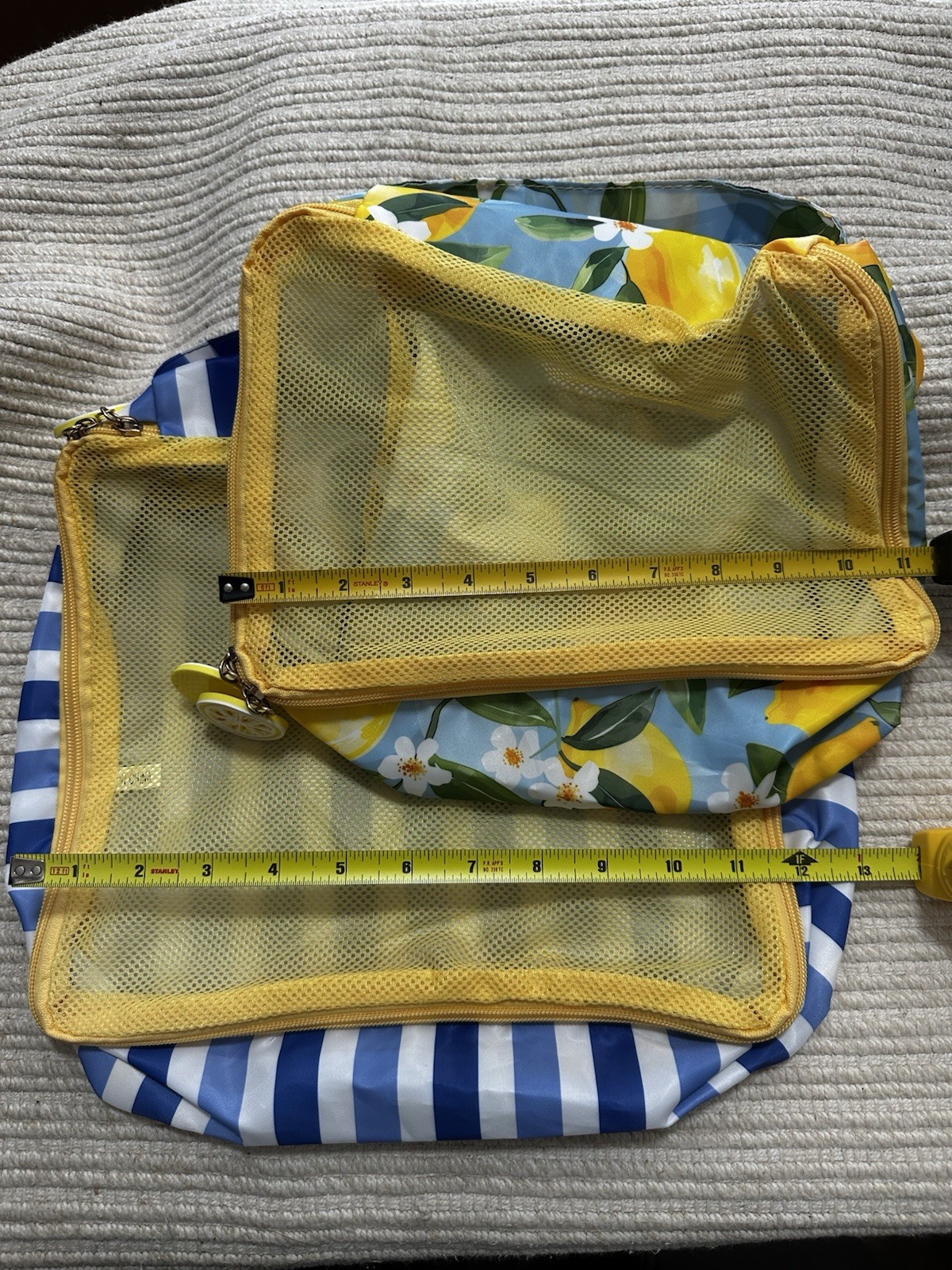 See images for item details. 2 mesh bags with handles *Lemon bag is 10.5 in x 7.5 in x 3.5 in *Stripe bag is 11.5 in x 10.5 in x 3 in