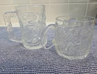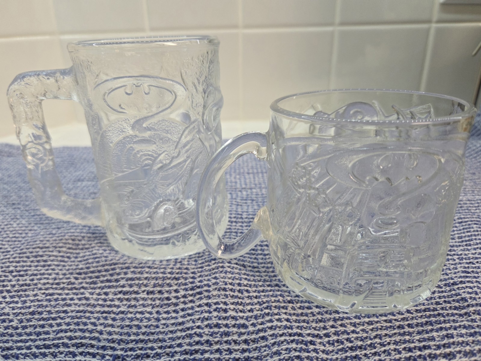 The product is a set of two vintage 1995 McDonald's Batman Forever clear glass mugs featuring Robin and The Riddler characters. These original advertising glasses are themed around restaurants and fast food, specifically showcasing the McDonald's Batman Forever Glass design. Made in the United States, these collectible items are a unique piece of nostalgia for fans of McDonald's and Batman Forever. The clear glass design gives them a sleek and retro look that would make a great addition to any collection of vintage memorabilia. No chips or cracks.