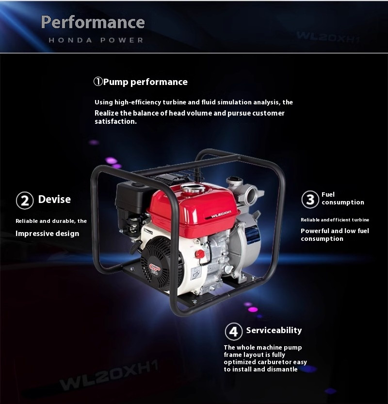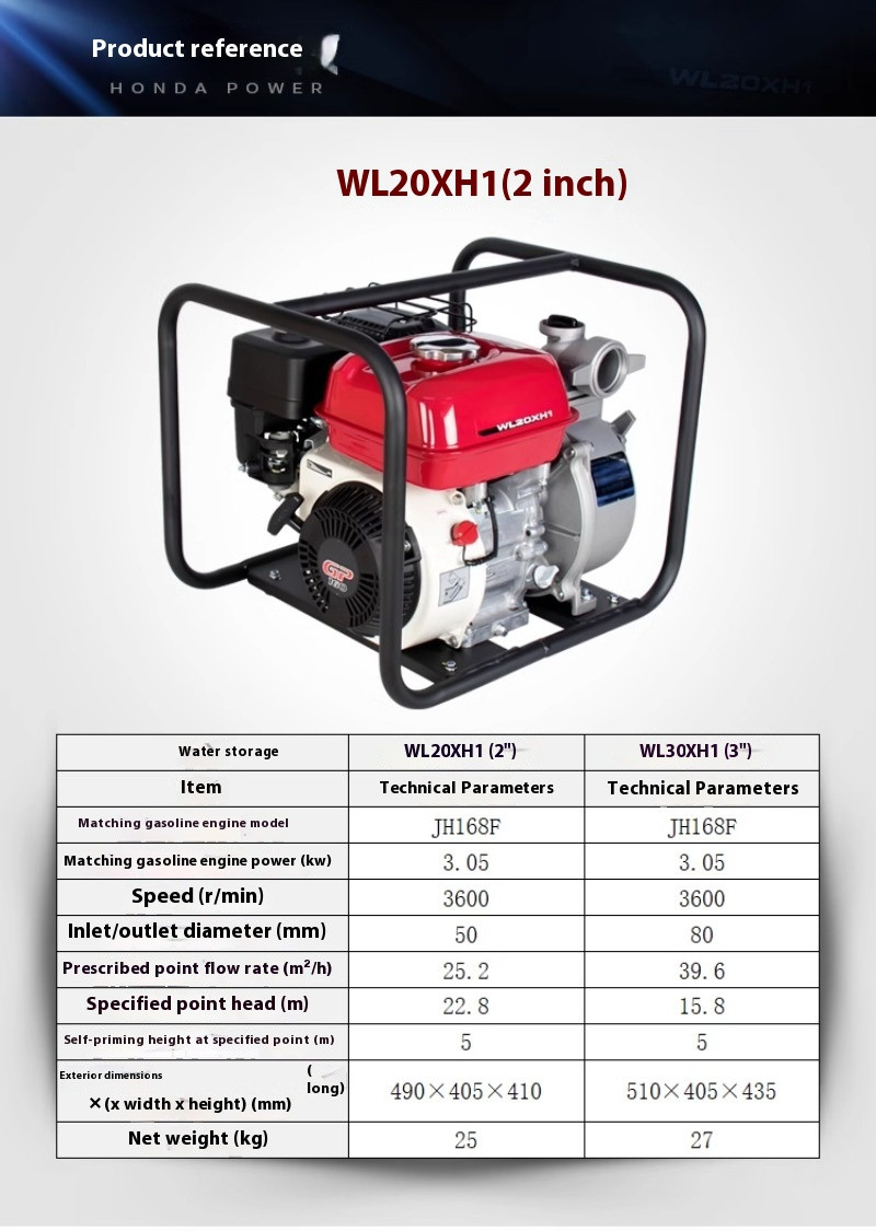WB20XH 2 inch Honda gasoline engine water pump 4 stroke agricultural irrigation WB30XH Water pump WL20XH1(2 inch) Item/Technical Parameters Matching gasoline engine model JH168F Matching gasoline engine power (kw) 3.05 Speed(r/min)3600 Inlet/outlet diameter(mm)50 Specified point flow(m/h)25.2 Specified point head(m)22.8 Self-priming height(m)5 Overall dimensions(L490X405X410XWxH)(mm) Net weight(kg)25