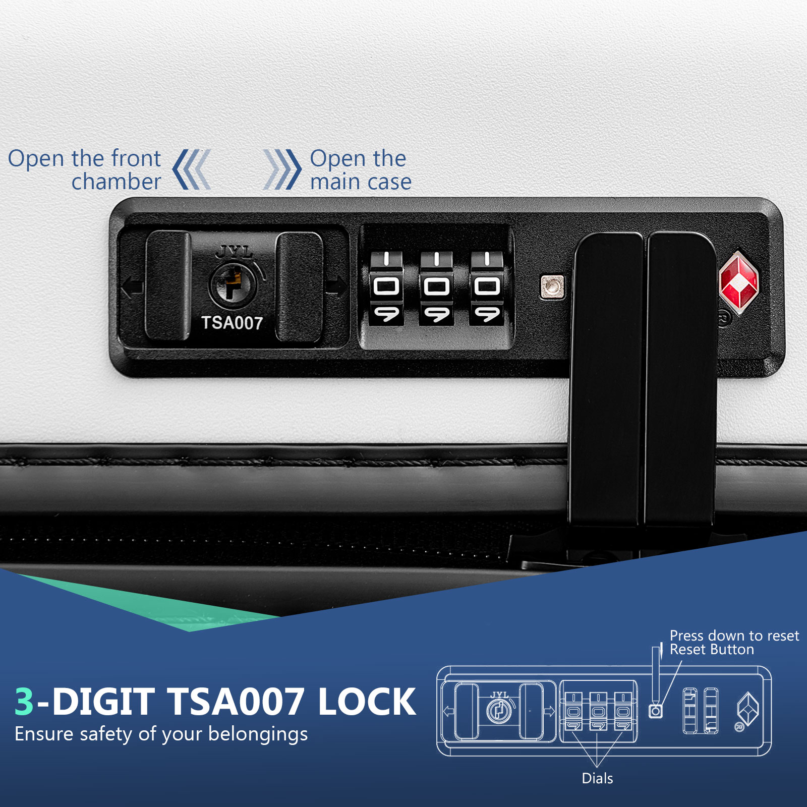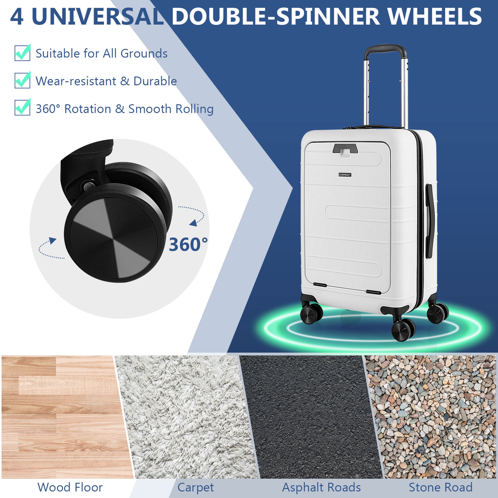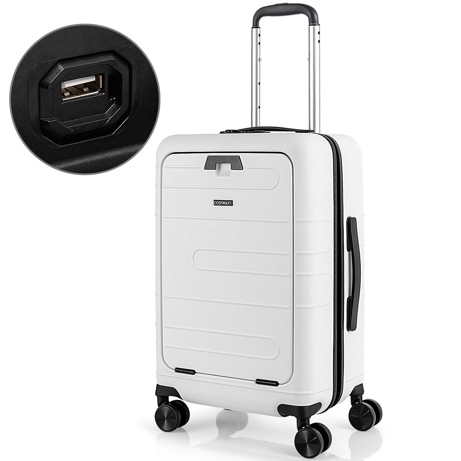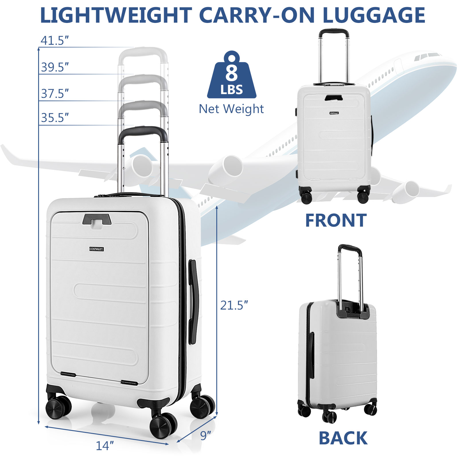 Detail Enjoying Your Trip with This Practical & Modern Carry-on Suitcase! Our 20" carry-on luggage measures 14" x 9" x 21.5"(L x W x H), which is enough for short trips and business travels, and it can load up to 88 lbs. The hardshell suitcase comes with a front pocket with 5 compartments: a padded laptop pocket, an iPad pocket, 2 ID bags, and a mesh pocket, meeting your multiple storage needs. And we suggest storing a 15.6" laptop and a 9.7" iPad. More than that, the spinner luggage is equipped with a foldable tabletop and a USB port, making your travel more convenient. And the 3-digit combination TSA lock keeps your belongings safe and secure. Quiet spinner wheels and a height-adjustable telescoping handle allow you to maneuver the suitcase easier, saving your effort. With an all-black appearance and clear lines, the practical hardshell suitcase can also add a sense of fashion for you. Front pocket allows you to separate electronics from clothes, easy to fetch 1-second foldable tabletop brings convenience for putting the iPad and drinks USB port design allows you to charge electronics more conveniently(power bank not included) TSA007 lock facilitates airport security inspections while keeping things safe Hardshell is made of PC material, , lightweight, and resists impacts 4 multi-directional double-spinner wheels, smooth rolling, 360° swiveling 100% aluminum telescoping handle is , sturdy, and lightweight Telescoping handle can be easily adjusted at 4 heights Large interior space with compartments hold your items in place Equipped with 2 handles on the top and the side for easy carrying Color: Navy/White Material: PC, Aluminum Overall Dimensions: 14" x 9" x 21.5"(L x W x H) Size of the Foldable Tabletop: 8.5" x 9" (L x W) 4 Adjustable Heights: 35.5", 37.5", 39.5", 41.5" Weight Capacity of Tabletop: 5.5 lbs Packing Capacity: 38L Net Weight: 8 lbs Package Included: 1 x Carry-on Luggage 1 x User’s Manual Shipping Policy Payment Method Returns Policy Shipping Policy Handling Time: 1~3 business day We do not ship to the addresses below: Canada Territories: NT, NU, YT and US Territories: Puerto Rico, Hawaii, Alaska, Virgin Island, Guam, APO For PO Box address, please provide complete physical address For Condo Apartment, please provide BUZZ code Ship via UPS from the United States of America Additional charges may apply to rural or remote area Tracking number will be updated once shipped out Payment Method Payment needs to be received within 24 hours or the transaction may be cancelled Please make sure your shipping address placed is correct Returns Policy If your item arrives defective or damaged, please contact us with a detailed description and digital picture of defective product as a proof of damage, we will figure out a proper solution for you. Items returned within 30 days of receipt may be refunded less a 20% restocking fee. The customer is also responsible for the shipping costs back to the warehouse in the USA. Items must be returned in their original new & unopened condition. We do not accept any returns on used. Copyright © 2017 DataCaciques Description Enjoying Your Trip with This Practical & Modern Carry-on Suitcase! Our 20" carry-on luggage measures 14" x 9" x 21.5"(L x W x H), which is enough for short trips and business travels, and it can load up to 88 lbs. The hardshell suitcase comes with a front pocket with 5 compartments: a padded laptop pocket, an iPad pocket, 2 ID bags, and a mesh pocket, meeting your multiple storage needs. And we suggest storing a 15.6" laptop and a 9.7" iPad. More than that, the spinner luggage is equipped with a foldable tabletop and a USB port, making your travel more convenient. And the 3-digit combination TSA lock keeps your belongings safe and secure. Quiet spinner wheels and a height-adjustable telescoping handle allow you to maneuver the suitcase easier, saving your effort. With an all-black appearance and clear lines, the practical hardshell suitcase can also add a sense of fashion for you. Front pocket allows you to separate electronics from clothes, easy to fetch 1-second foldable tabletop brings convenience for putting the iPad and drinks USB port design allows you to charge electronics more conveniently(power bank not included) TSA007 lock facilitates airport security inspections while keeping things safe Hardshell is made of PC material, , lightweight, and resists impacts 4 multi-directional double-spinner wheels, smooth rolling, 360° swiveling 100% aluminum telescoping handle is , sturdy, and lightweight Telescoping handle can be easily adjusted at 4 heights Large interior space with compartments hold your items in place Equipped with 2 handles on the top and the side for easy carrying Color: Navy/White Material: PC, Aluminum Overall Dimensions: 14" x 9" x 21.5"(L x W x H) Size of the Foldable Tabletop: 8.5" x 9" (L x W) 4 Adjustable Heights: 35.5", 37.5", 39.5", 41.5" Weight Capacity of Tabletop: 5.5 lbs Packing Capacity: 38L Net Weight: 8 lbs Package Included: 1 x Carry-on Luggage 1 x User’s Manual Shipping Policy Payment Method Returns Policy Shipping Policy Handling Time: 1~3 business day We do not ship to the addresses below: Canada Territories: NT, NU, YT and US Territories: Puerto Rico, Hawaii, Alaska, Virgin Island, Guam, APO For PO Box address, please provide complete physical address For Condo Apartment, please provide BUZZ code Ship via UPS from the United States of America Additional charges may apply to rural or remote area Tracking number will be updated once shipped out Payment Method We accept payment by PayPal Payment needs to be received within 24 hours or the transaction may be cancelled Please make sure your shipping address placed is correct Returns Policy If your item arrives defective or damaged, please contact us with a detailed description and digital picture of defective product as a proof of damage, we will figure out a proper solution for you. Items returned within 30 days of receipt may be refunded 