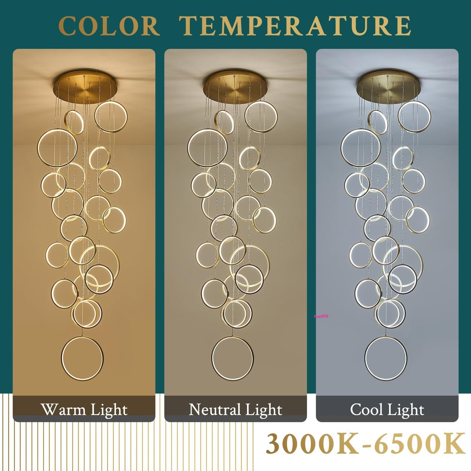 Features: LONG CHANDELIERS FOR HIGH CEILINGS: Crafted from premium aluminum and silicone, this large foyer chandeliers boasts 20 rings gracefully cascading that descend from a sleek ceiling plate. The striking gold finish and innovative design merge seamlessly to create a bold, modern statement piece that transforms your high-ceilinged living space. DIMMABLE MODERN LED CHANDELIER WITH REMOTE CONTROL: This long entryway chandelier is dimmable. You can adjust the color temperature from 3000k warm white to 6500k cool white and choose different brightness(10% -100% ) by remote control as you like. The ideal luminous output is up to 7800lm, CRI>90, and 130W(Containing Light Source). ADJUSTABLE LONG CHANDELIER HIGH CEILINGS : The ring chandelier features 137" (max) adjustable strings, allowing you to effortlessly customize its shape. Unleash your creativity during installation to create an elegant and brilliant artistic chandelier that complements your unique home style. SLEEK FOYER CHANDELIER FOR LOFTY SPACES: Elevate your interior design with our cutting-edge large entryway chandelier, a masterpiece of minimalist elegance. It will perfectly fit the height of your ceiling. It is perfect for a living room, staircase, foyer, or other high ceiling space. EFFORTLESS INSTALLATION: This modern gold chandelier is designed for your convenience. It comes with all the necessary mounting hardware and an easy-to-follow installation manual, ensuring a quick and hassle-free setup. Payment About us Return and feedback Delivery time Pay attention Payment International Buyers – Please Note: a) Import duties, taxes and charges are not included in the item price or shipping charges. These charges are the buyer's responsibility. b) Please check with your country's customs office to determine what these additional costs will be prior to bidding/buying. About us We are pleased to offer the most up to date items at competitive prices. You can rely on us to deliver the most on demand products within short timescales. Return and feedback We hope you love our product but if for any reason you want to return it or you’re not fully satisfied with your new product, please contact only Via eBay Message ,please Do not open case or return or left negative and neutral feedback ,we can solve it happily by messaging. Delivery time 1.Items will be shipped to buyer's eBay registered address. Please confirm your eBay address before you make the payment. We don't accept to revise address after you make an order. 2.Items location is in China, due to geographical distance, please be advised that the international shipping usually take longer than domestic. 3.All lights come seperately,need to be assembled by buyer,we highly suggest to hire a electrician. Pay attention 1.please make sure you write correct address,we are not able to revise address after you make an order. 2.item maybe come with several packages,please message us if you only get part of them or something missing. 3.if there has accident,please do not open return or item not received case or left negative and neutral feedback before you contact only Via eBay Message ,we are glad to offer reasonable solution.