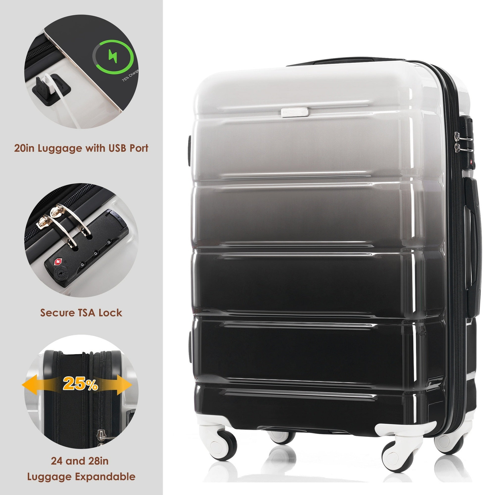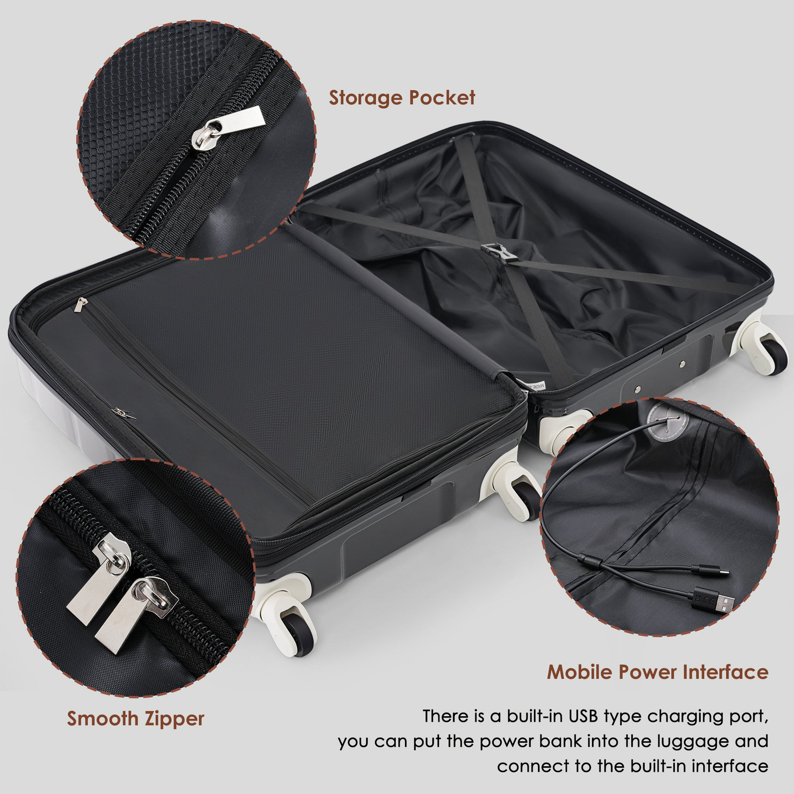 Specifications Place of Origin #originPlace# Main Color Black+Gery Main Material ABS+PC Dangerous Goods #dangerFlag# Dimensions & Weights Assembled Length (in.) 19.20 Assembled Width (in.) 11.60 Assembled Height (in.) 28.40 Weight (lbs) 24.25 Product Features 【High Quality Luggage Sets】Made from extra strong ABS+PC material, which is lightweight and extremely durable. Features textured finish to prevent against scratches,keeping lightweight luggage set beautiful trip after trip. 【3 Piece Luggage set】The 20' carry on suitcase features USB charging ports (Power bank not included), 24', 28 'are expandable, adding 25% space capacity for hardshell luggage. 【Easy Maneuvering】 4 360-degree rotating wheels make this suitcase as mobile as they get. Regardless of direction, these wheels allow your suitcase to stay upright while getting pushed, pulled and dragged in any direction. 【Side hooks】 Side hooks to reduce the burden on hands. 【Handy Packing】 Includes a spacious, highly functional interior with mesh pockets and elastic tie-down straps. Pack neatly and securely. 【Free Your Hands】 The newly designed cup holder is perfectly integrated into the structure of the spinner luggage, providing you with a convenient option to put your cup on the go without worrying about it tipping or slipping. Description