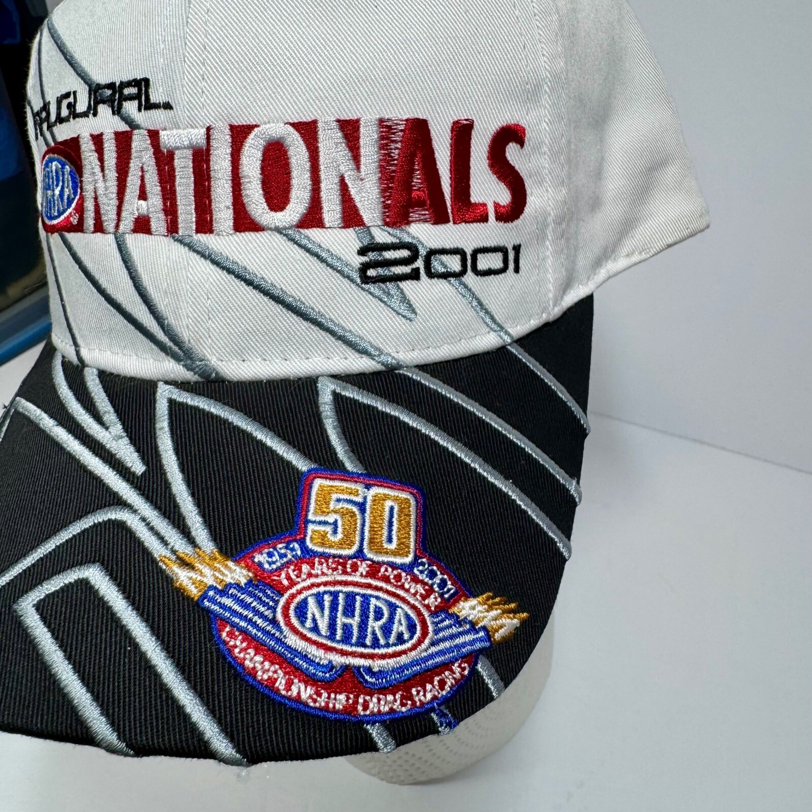 Own a piece of racing history with this Inaugural NHRA Nationals 2001 Chicago hat! This eye-catching cap commemorates the 50th anniversary of NHRA's "Years of Power." The hat features bold embroidery, including the "Inaugural Nationals 2001" text and the NHRA 50th-anniversary logo. The striking black and white color scheme, accented with red and blue details, makes this hat a standout accessory. The adjustable snapback closure ensures a comfortable fit for most. Perfect for wearing to a car show, a day at the races, or simply as a statement piece for any casual occasion. Style: Racing Cap Color: White Department: Men Features: Adjustable Pattern: Geometric Material: Polyester, Cotton Fabric Type: Canvas Character: Racing, Car, Race Car Occasion: Casual Keywords: NHRA, Nationals, Inaugural, 2001, Chicago, Racing, Hat, Cap, 50 Years of Power, Motorsports, Drag Racing, Embroidered, Snapback, Vintage, Collectible