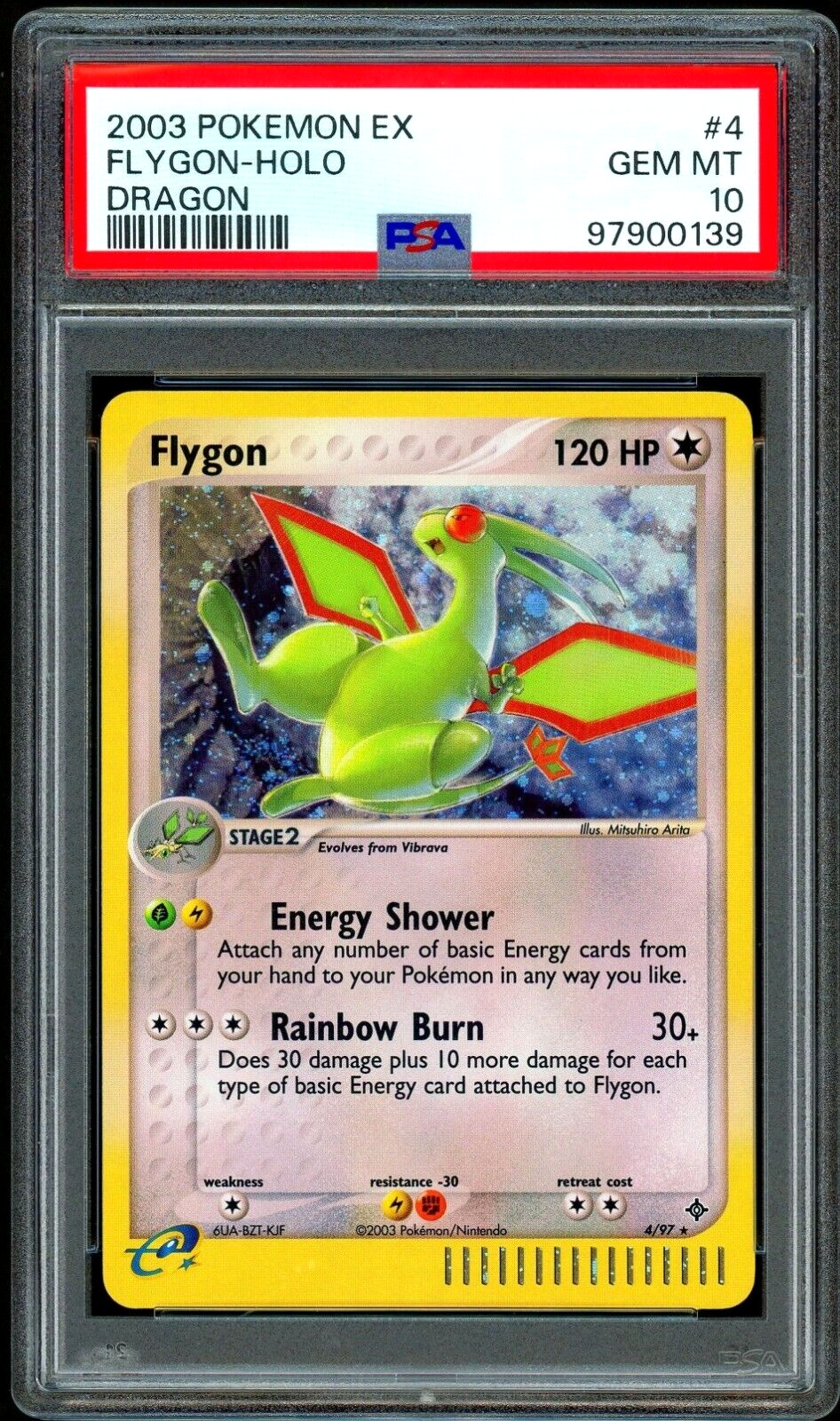 Pokémon FLYGON #4/97 Holo Rare - Graded PSA 10 GEM MINT - from 2003 EX DRAGON SET e-Reader Edition Series as shown...with a nice Foil SWIRL as should be clearly evident in the listing photos!! ***I will state Card Condition to be ” GEM MINT ” as determined by PSA Grading Services, but please judge overall card condition for yourself. Please assume the PSA CASE itself may also have the typically seen faint/light surface scratch lines on the front and/or back from the PSA encapsulation process.*** The Exact PSA 10 Flygon Ex Dragon Set Holographic Foil Rare eReader Series Pokemon Card shown in the photos and clearly described above will be securely packaged and shipped within a padded Bubble Mailer. Please Review the Quality Photos Attached…What You See, Is What You Get! I currently ONLY Ship Within the U.S. to CONFIRMED Addresses associated with payment, UNLESS purchase is made via eBay's Global Shipping Program! Please Message With Questions, Thanks!