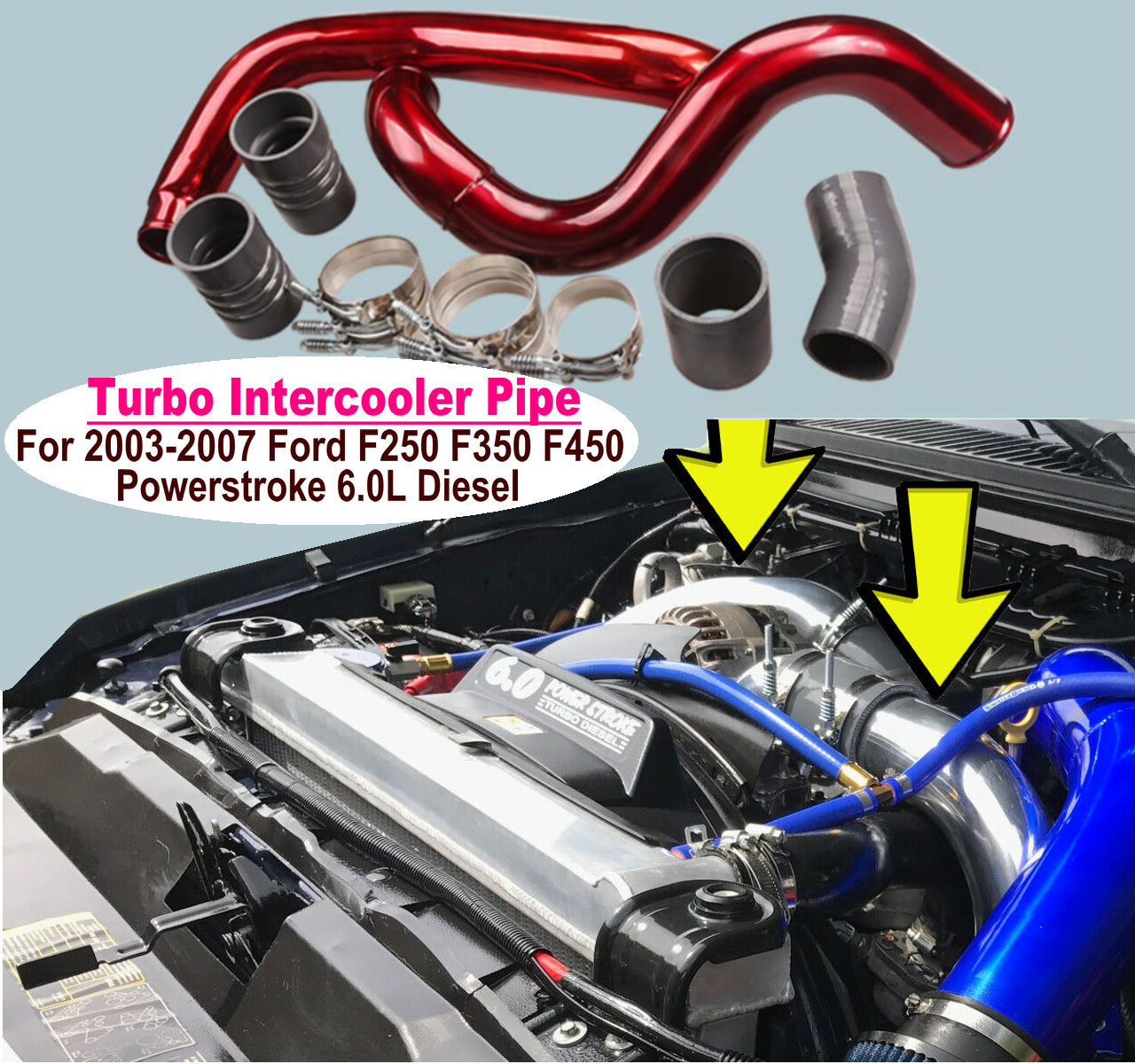 Store Categories Store Categories Ford 3 Row Radiator 4 Row Radiator Chevy 3 Row Radiator 4 Row Radiator Dodge Ram 3 Row Radiator 4 Row Radiator jeep 3 Row Radiator 4 Row Radiator Air Intake Pipe Intercooler Parts Intercooler Pipe Kits Intercooler Other New~Complete For 2003-2007 Ford F250 F350 F450 F550 Powerstroke 6.0L V8 Diesel Turbo Intercooler Piping kit with Couplers and Heavy Duty T-Bolt Clamps Product Description New~Complete For 2003-2007 Ford F250 F350 F450 F550 Powerstroke 6.0L V8 Diesel Turbo Intercooler Piping kit with Couplers and Heavy Duty T-Bolt Clamps Vehicle Compatibility: Vehicle Compatible with All 6.0L Powerstroke Turbo Diesel Engines Including The Following Vehicles 2003-2007 Ford F-Series / Excursion 6.0L (363cid) OHV V8 Powerstroke Diesel Turbo 2003-2007 Ford F-250 Super Duty 6.0L 363ci OHV V8 Diesel Turbo 2003-2007 Ford F-350 Super Duty 6.0L 363ci OHV V8 Diesel Turbo 2004-2007 Ford F-450 Super Duty 6.0L 363ci OHV V8 Diesel Turbo 2003-2007 Ford F-550 Super Duty 6.0L 363ci OHV V8 Diesel Turbo 2003-2005 Ford Excursion 6.0L 363ci OHV V8 Diesel Turbo Only Fits Ford 6.0L Turbo Diesel Engine. Please be sure to check the size of this product carefully before ordering to avoid unusable. Compatible with OEM part numbers: 3C34-6C640-CA, 3C34-6C640-DA, 3C34-6K769-AB, 3C3Z-6K769-CA, 5C34-6C646-AH, 5C34-6K769-AA, 6C34-6C640-AA, 6C34-6C640-BA, 6C34-6C640-CA, 6C34-6C646-AF, 6C3Z-6C640-A, 6C3Z-6C640-AA, 6C3Z-6C640-B, 6C3Z-6C640-C, 6C3Z-6C646-A, 6C3Z-6C646-BA, 6C3Z-6K769-B Specifications: Product Type: Turbo intercooler Piping kit intercooler kit features 3-inch piping can achieve maximum airflow. Diameter of intercooler pipe: 3" / 7.6 cm Package Dimensions: 25.6" x 12.6" x 8.7" (65 x 32 x 22 cm) 1) Color: Red Pipe & Gray Silicone Boots 2) Material of Pipe: Aircraft T-6061 grade Aluminum Stainless steel, silicone 3) Includes: Hot Side + Cold Side 4) These aftermarket charge pipes will not split or crack like the factory OEM pipes. 5) Heavty duty four ply silicone boots. 6) Stainless steel T-bolt clamps. 7) Allow maximum airflow through the stock manifold system and Intense deep sporty Sound. 8) Improve throttle response throughout low and mid RPM. 9) Easy to install and easy to fit with simple tools. 10) No additional parts will be needed for installation after you purchase this kit. Package Included 2 x Aluminum Intercooler Pipes 4 x Silicone Boots 2 x Stainless Steel T-Bolt Clamps (72-80mm) 5 x Stainless Steel T-Bolt Clamps (84-92mm) 1 x Stainless Steel T-Bolt Clamp (90-98mm) No installation guides are included, we highly recommend to seek professional installation. (As pictures shown) Description: The Diesel Performance Turbo intercooler Piping kit for your 2003-2007 Ford 6.0L Powerstroke solves the common issues with the factory supplied plastic pipe and intercooler boot, that are known to explode or burst due to the heat and boost levels of your 6.0L Powerstroke. The upgraded design from Diesel Performance increases reliability, durability and performance. Constructed of mandrel-bent aluminum with a polished finish. A 100% CNC-machined Aircraft t-6061 grade aluminum coupling allows you to retain your trucks factory emissions components and allows for a quick install. Constructed of mandrel-bent Aircraft t-6061 grade aluminum with a polished finish. A 100% CNC-machined Aircraft t-6061 grade aluminum coupling allows you to retain your trucks factory emissions components and allows for a quick install. The Diesel Performance cold-side pipe eliminates restrictive bends in the factory pipe, allowing for improvements in airflow, power, and EGTs. To add even more reliability this kit includes Diesel Performance Constant-Tension T-bolt Clamps for accurate and consistent holding power. This cold-side pipe and boot kit is the perfect addition to your 6.0L Powerstroke truck. Features: We This Turbo intercooler Piping kit Made from Aircraft t-6061 grade aluminum High strength, good corrosion resistance for prolonged lifespanand with Polished finish We Not cheapo cheapo like the others.. Turbo intercooler Piping kit is made of T-6061 aircraft aluminum.High strength, good corrosion resistance Its different from other sellers T-3303 Series. In fact, T-6061 series Aluminum is much better than T-3303 series. More than 90% of aftermarket manufacturers use the T-3303 series Aluminum, because it is cheaper and easier to get the material. However, T-3303 aluminum has many disadvantages, such as poor polishing effect, softness, easiness to scratch and corrode We All Products With Made By OEM Approved & ISO Certified Manufacturers With Materials That Meets Or Exceeds Strict OEM Requirements NOTES: 1. The color of the actual items may slightly different from the listing images due to different computer screen, thanks for your understanding. 2. All dimension are measured by hand, Please allow 0.5-1 inch difference due to manual measurement.(1inch=2.54cm). 3. Instruction is not included.Professional Installation Is Highly Recommended! Payment Policy Shipping Policy Returns Policy Feedback Terms of sales Payment Policy We only accept ebay payment. All payments should be received within 7 working days after auction has ended. Non-paying bidders will be reported to ebay. If you can not pay in time, plz contact us. Shipping Policy Item will be shipped out within 48 hours upon receipt of your payment through Air mail. Please make sure your address in eBay is correct. If you want to c hange the address, please give us an ebay message right away once you make the payment. Combing shipment is not allowed. If you want to combine all the items together, you should still pay for all of the shipping, insurance and handing fees. Considering the cost of business and easy shipping, usually the item is packed in retail packaging. Returns Policy Our return policy fully complies with E-bay's return policy. Item can be returned or exchanged . Refund is available if you are not entirely happy with your purchase. Items m