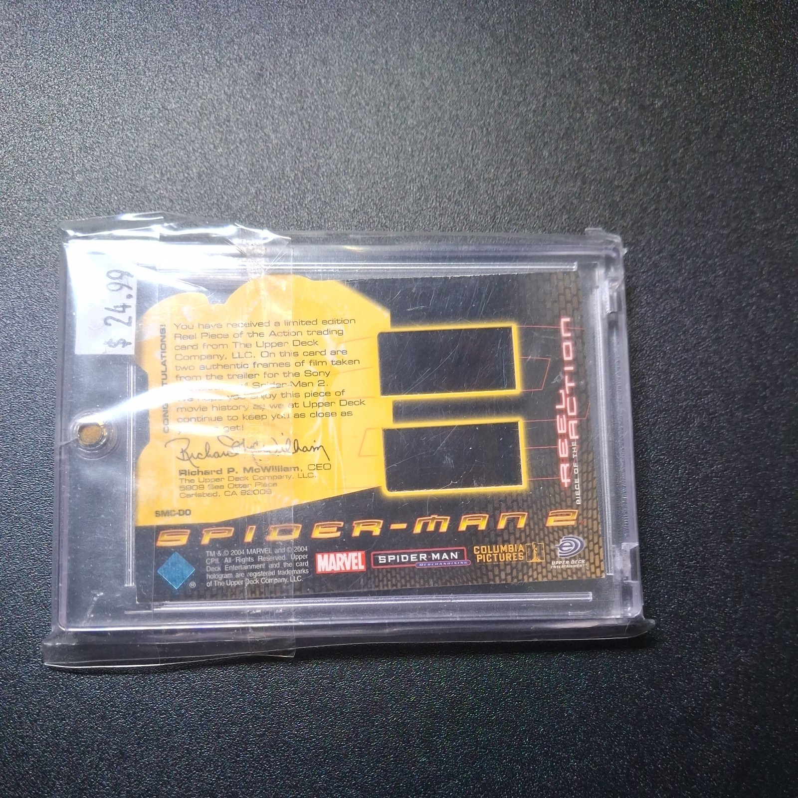 The product is a 2004 Spider-Man 2 Reel Piece Of The Action Card smc-00. This non-sport trading card is part of the Spider-Man franchise and features an action genre. The card is in excellent condition and is ungraded. It is a collectible item that would appeal to fans of the Spider-Man movie series, particularly those interested in trading cards related to the action scenes in the films.