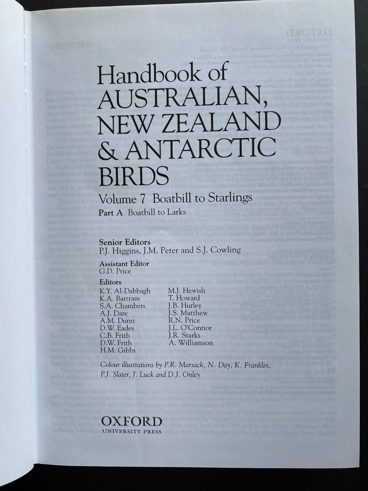 Express Shipping Worldwide is Free Handbook of Australian, New Zealand and Antarctic Birds: Boatbill To Starlings Volume 7A - Boatbill to Larks and Volume 7B - Dunnock to Starlings By Peter Higgins, et al., editors Published by Oxford University Press , Melbourne, 2006 Both volumes First Edition and both in brand new pristine condition, unread. In 2,200 pages with 54 colour plates plus numerous text illustrations, and many maps. The Dustjackets: There is no shelfwear. There is no foxing. There is no sunning to the dustjacket spine. There are no tears, chips, or creases. The Books: There is no shelfwear. There is no foxing. There are no previous owners' names or inscriptions. All of the plates are fresh, bright and crisp - pristine. There are no missing, creased, loose, stained or damaged pages. They are complete and original. Each species account includes sections on field identification, habitat, distribution and population, movements and migration, food, social organisation, social behavior, voice, breeding, plumage and morphology, and references. Volume seven completes coverage of the passerines (also known as the songbirds or perching birds) and provides detailed descriptions of 168 species, including the flycatchers, currawongs, riflebirds, ravens, bowerbirds, grass finches, swallows and white-eyes. The 54 colour plates are by renowned bird artists which depict all extant species in fine detail. Species of particular interest include the bowerbirds, the Australian finches, and the white-eyes, including the Silvereye. Each measures 20cm x 27cm x 5cm and weigh a significant 5 kgs unpacked. BOXED AND EXPRESS SHIPPED is Free Worldwide All items are securely and well packed. Thank you for viewing my item.