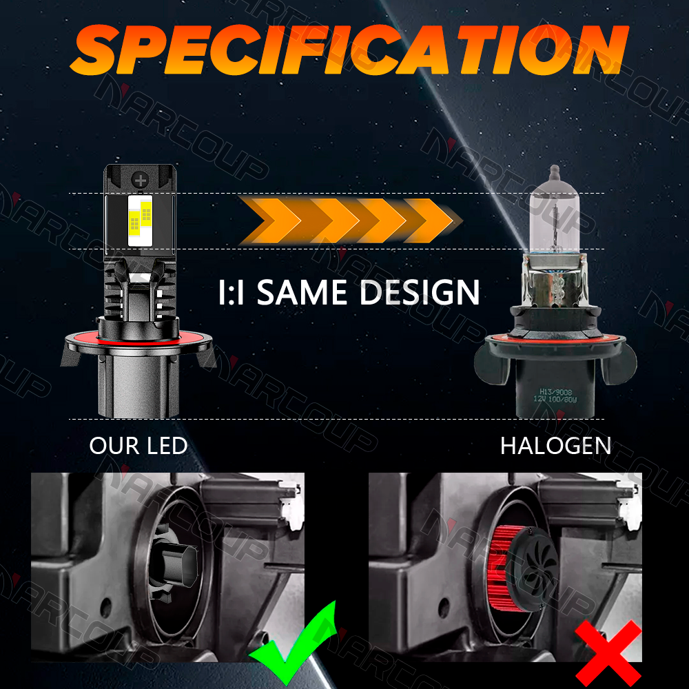 Our LED bulbs only replace halogen or led headlamps.Can not replace the HID headlamps. Please double check before order. Product Description: For some vehicles,For example, For Jeep Gladiator/Patriot/Compass, For Mini Cooper, For Ford Explorer/F150/250/350/450/550, For Chrysler, For Dodge Ram 1500, 2500, 3500, For Nissan Sentra, For Chevrolet Cruze; The above models may not be decoded, and it is not recommended to purchase this product. The Bulbs are compatible with universal vehicles: Motorcycle,Motorbike,Bike,car, van, truck, pickup, SUV, bus, Wagon,UTB,off-road, ATV, dune buggy, forklift, tractor etc.(IF your plug type is same,it can fit your car.) Specification: Plug Type: H13/9008,High Low Dual Beam Power(per set): 100W@high beam, 100W@ low beam LED Quantity(each bulb): 4pcs* High Power COB chips Luminous Flux: 20000lm/set(10000lm/bulb) Operating Voltage: DC 9-32V(fit 12V,24V vehicles) Color Temperature: Pure White 6000K-6500K IP67 rated water and dust seal,over 50000hrs lifetime Beam Angle: 270 degree@low beam,360 degree@high beam Material: Aviation 6063 aluminum profile Operating Temperature: -40-80 degree Celsius Usage: headlight,high low beam Feature: (2pcs/set)H13 COB Hi-Lo Beam LED headlight conversion kit. Latest COB chip (USA) light source,4 luminous faces(270/360 degree) no blind zone Engineering beam pattern design throw more light on road evenly at appropriate angle without foggy light. Xenon White light reflect road paint/signs better to show clearer road situation during night driving. 270 degree low beam angle with cut-off line,will not dazzle oncoming traffic. All-in-one heat conduction+high speed mute fan system keep the light bulb in appropriate working temperature. Built-in constant current CPU, instant full brightness without start-up relay. Two-way heat dissipation channel: 1. All-in-one aluminum profile as heat conduction system, 360 degree heat radiating 2. High speed mute fan (12000R/Min),high Air flow for faster cooling rate Package Included: 2 x H13 LED headlight bulbs New boxes and old boxes are sent randomly!!!
