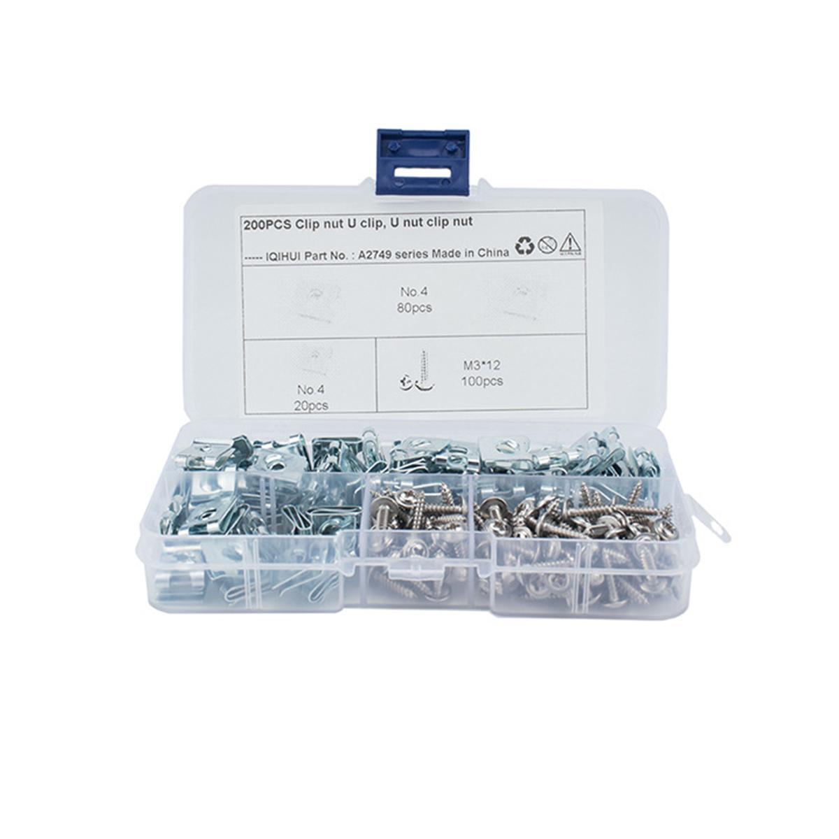 Product Description 200Pcs Speed Fasteners U Nuts Self Tapping Screw Spire U Clips Interior Moulding Trim Panels Add our listing to Watchlist Or Add to Cart , you will get more discount Description: 1. Product material: nut 65 manganese steel, screw stainless steel 304 2. Product attributes: blue and white zinc, strong rust resistance, the surface is not easy to oxidize and change color 3. Product application: motorcycles, automobiles, etc. 4. Product function: The fasteners connecting the plastic decorations to the car body have high elasticity, high strength and high hardness, and the plywood nut will not fall during the transportation of the supporting parts, and the installation is convenient and quick. Mainly play a solid role in the link between products. 5. Product specifications: No.4-100pcs M3*12-100pcs The package includes: 200PCS eBay Cross Border Trade powered by ChannelEffect