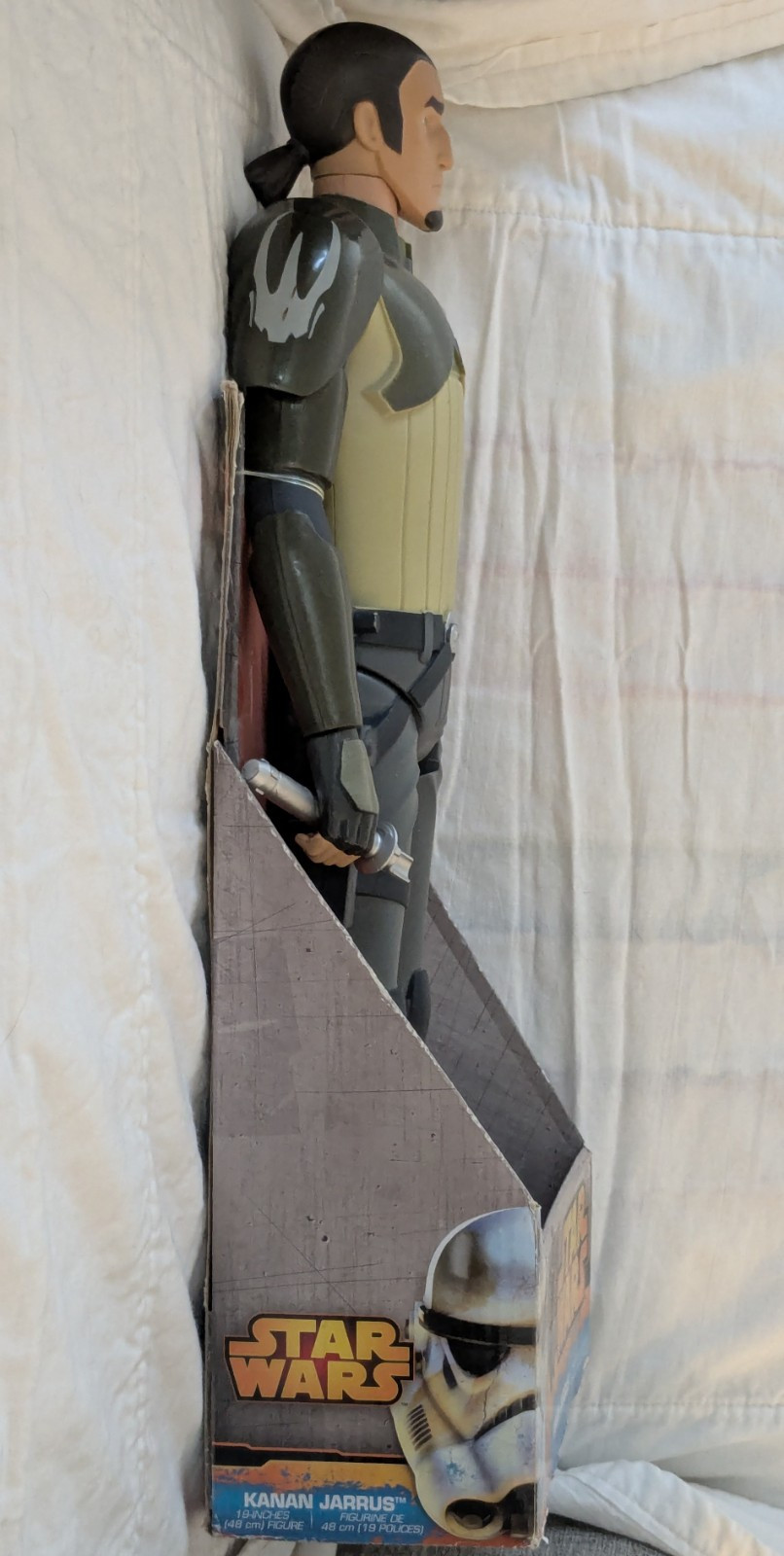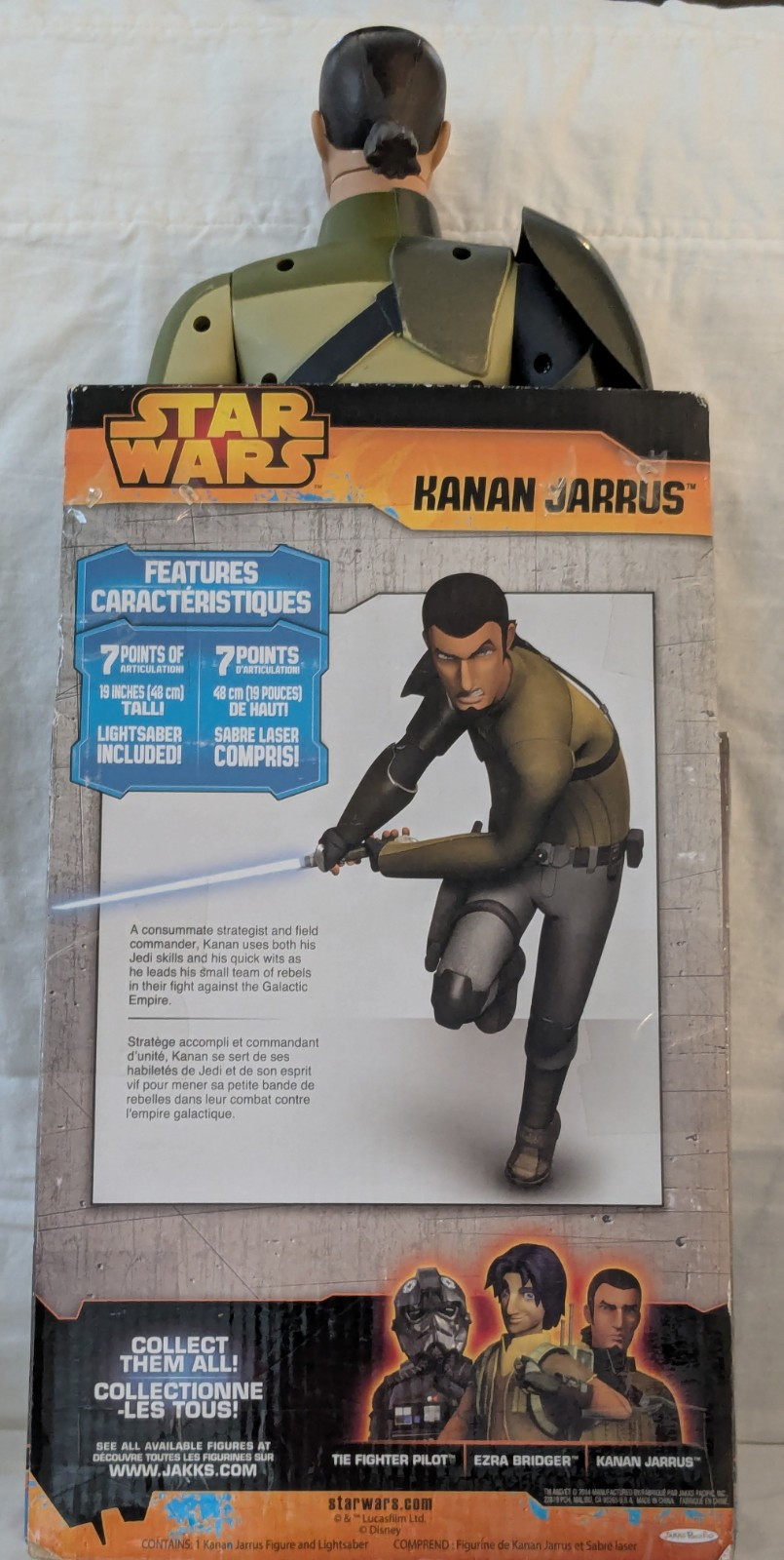 This Star Wars Kanan Jarrus action figure stands at 19 inches and is from the Rebels series by JAKKS Pacific. The character is one of the main protagonists in the Star Wars franchise and will make a great addition to any collection. The packaging is unopened and the recommended age range for this item is 3+. It was manufactured in 2014 and features detailed designs of the character. The animation studio behind this figure is Disney and it is part of the Star Wars franchise. The toy is an action figure type and is perfect for fans of the Rebels series. The item also features the work of artist War. Add this Kanan Jarrus action figure to your collection today! Star Wars Kanan Jarrus action figure stands at 19 inches and is from the Rebels series by JAKKS Pacific. The character is one of the main protagonists in the Star Wars franchise and will make a great addition to any collection. The packaging is unopened and the recommended age range for this item is 3+. It was manufactured in 2014 and features detailed designs of the character. THE PACKAGING HAS SOME SHELF WEAR AND SCUFFS. See pics for details.