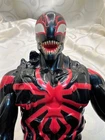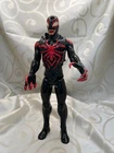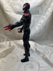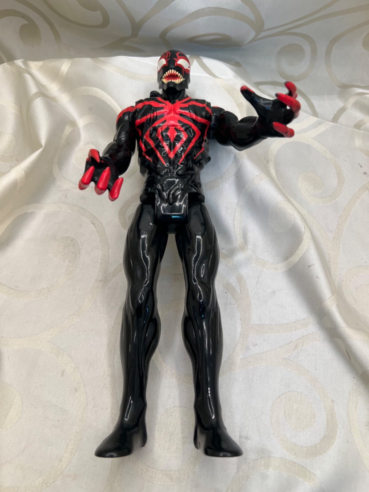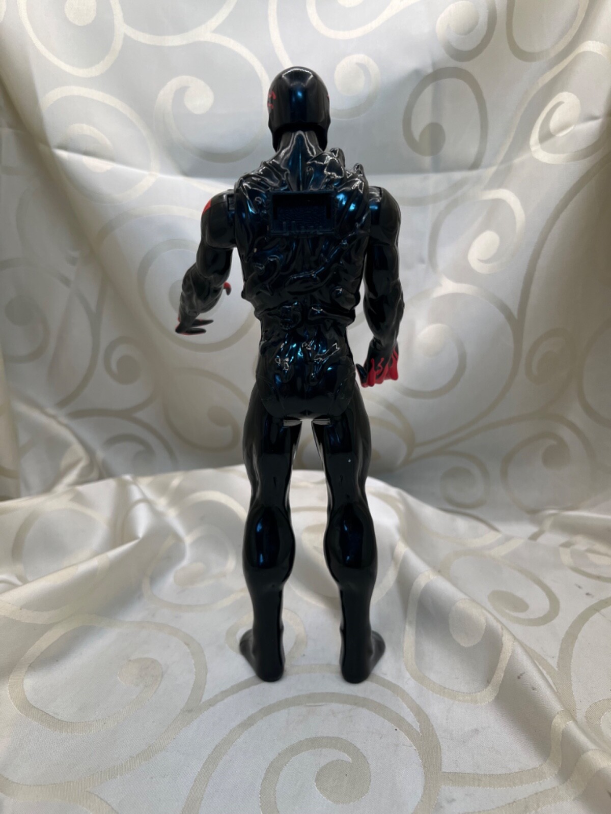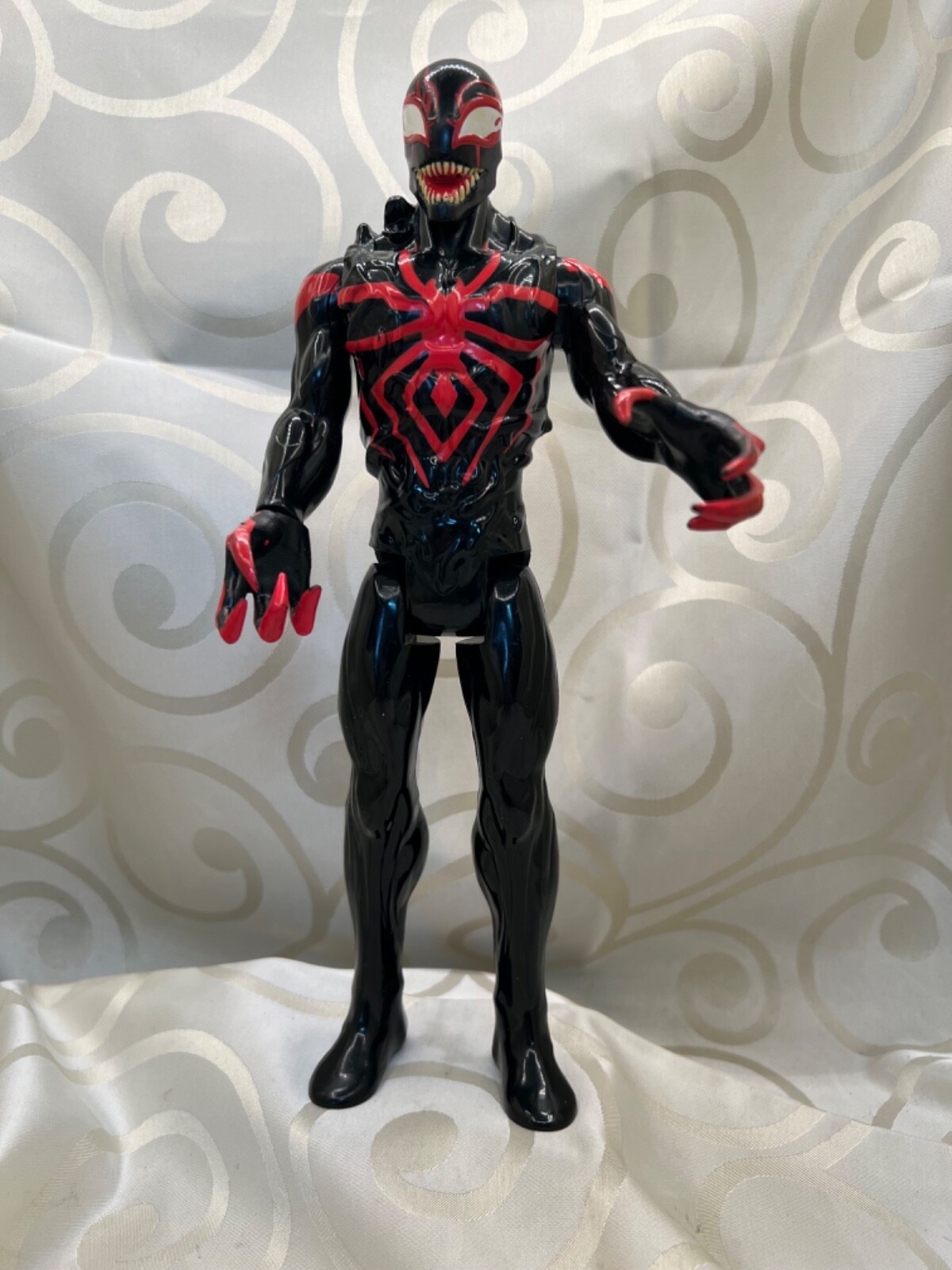 The product is an 11.5-inch Venom Miles Morales action figure from the Marvel Titan Hero Series. It features the character Max in his superhero persona, with a black color scheme. Manufactured in 2017 in China, this plastic figure is an original reproduction and comes without packaging. Part of the Heroes franchise and the superhero genre, it is a representation of the popular Spider-Man character Miles Morales.