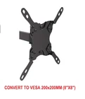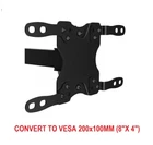 VESA Adapter TV mount adapters extend VESA mounting holes pitch from 100x100 to 200x200 or 200x100 so larger TVs can fit For the Adapters to fit on your mount. Your mount’s plate HAS TO BE 100x100 mm or 4”x4”. Make sure your TV mount can handle the weight of your new TV Allow your 100x100 or 4"x4" TV mount plate to fit larger TVs with VESA mounting patterns 200x200 or 8” x 8” and 200x100 or 8”x 4” allowing you to adapt from one size to another. Please note; they WON'T WORK if your mount is larger than VESA 100x100 or 4"x 4" Hardware M5x12mm (8 screws) M5 nut (4 set) M6x14mm (4 screws) M8x20mm (4 screws) D8 washer (4 set) Small space(8 set) Universal wall mount adapter. Apply to any wall mount with VESA 100x100mm and 75x75mm Supports VESA 200mm x 100mm,200mm x 200mm Standard mounting hardware included Powder-coated black finish, 4pcs/pack Fits most tv from 23" to 42"