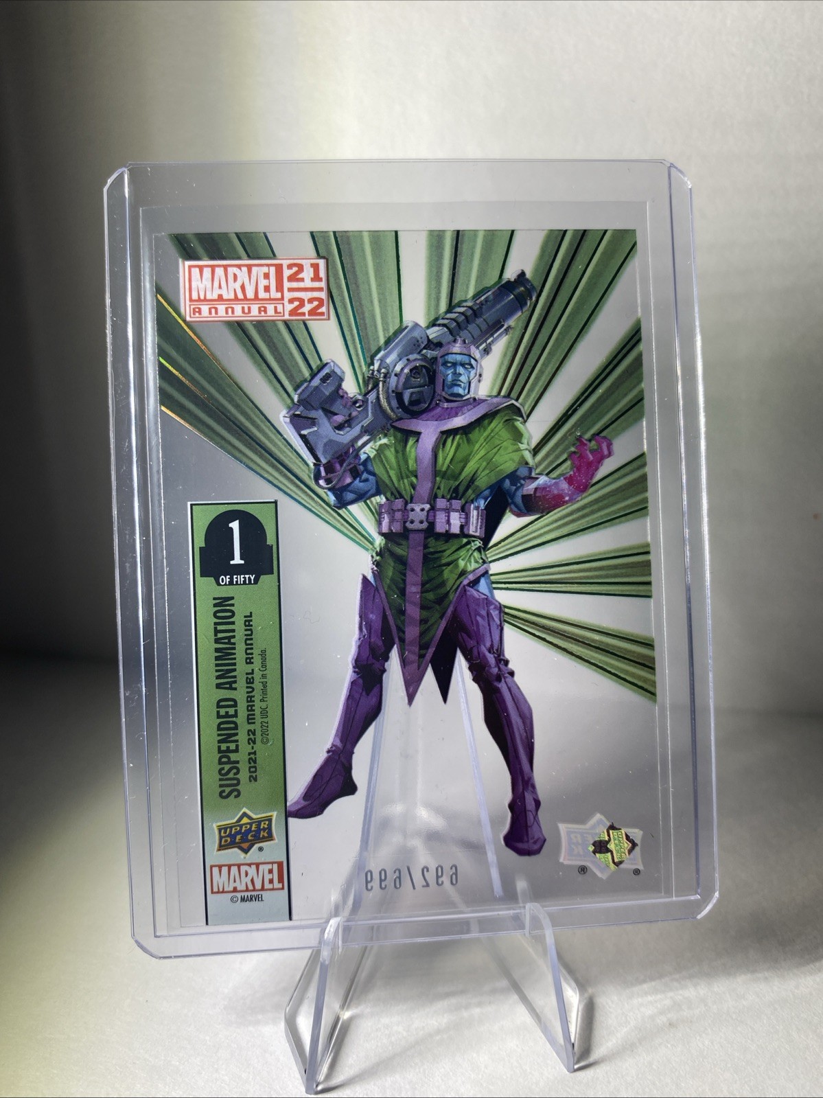 The 2021 Upper Deck Marvel Annual Kang Suspended Animation trading card is a limited edition collectible featuring the character Kang from the Marvel Cinematic Universe. Part of the 2021-22 Upper Deck Marvel Annual set, this single-insert card is serial numbered 692 out of 699, making it a rare find for fans and collectors. With its standard size and English language, this card is a must-have for any Marvel enthusiast looking to add a unique piece to their collection.