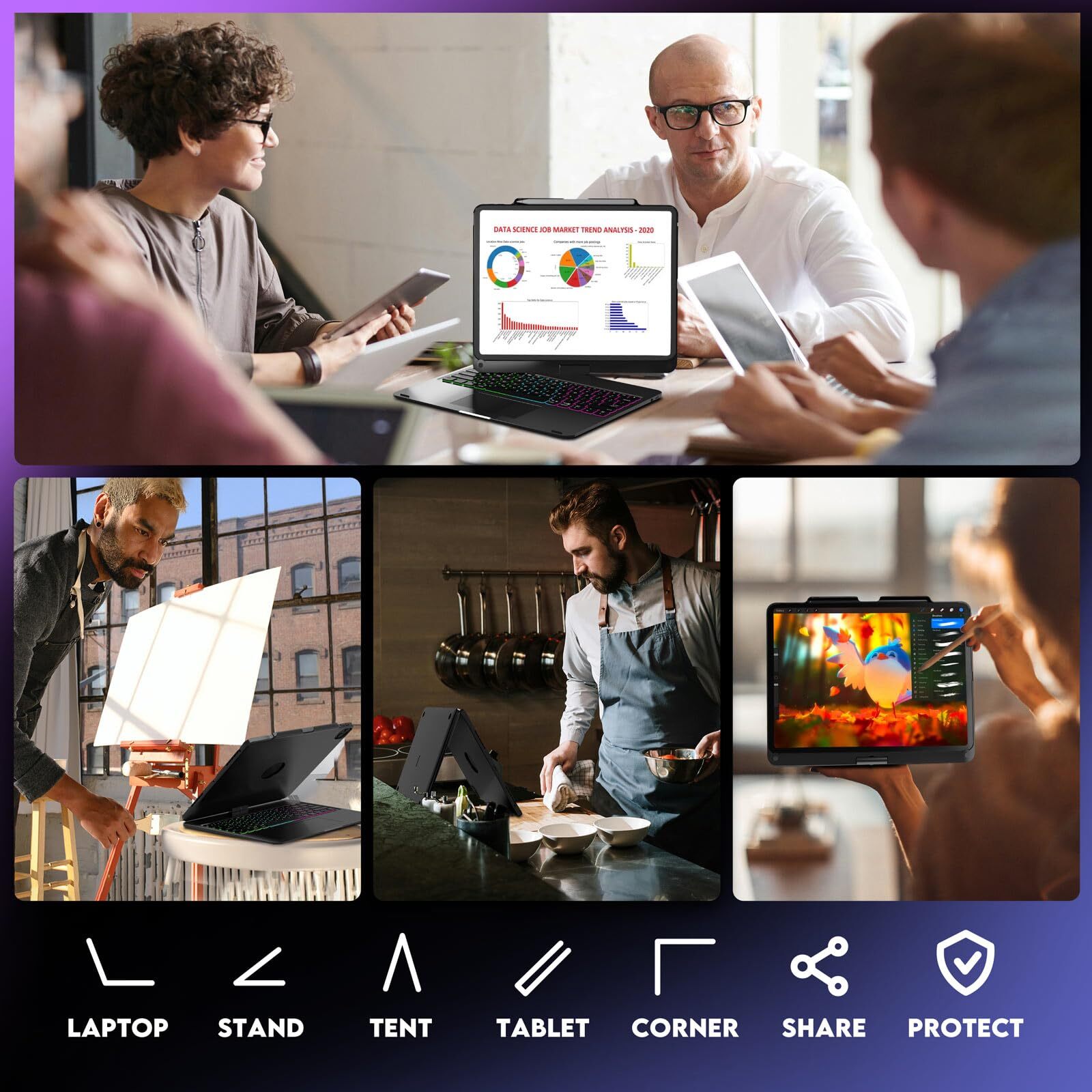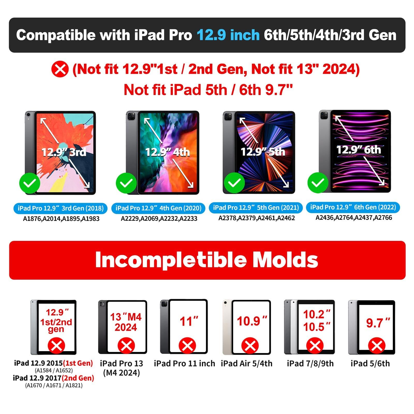 ❌⚠️【NOT FIT】NOT FIT for iPad12.9 inch 1ST GEN-A1584/A1652, iPad Pro 12.9 inch 2ND GEN-A1670/A1671/A1821, NOT FIT for iPad 5th/6th 9.7 inch ❤️【1 Year Replacement】 - iPad pro 12.9 case with keyboard REPLACEMENT is offered within 1 year by BABG. We provide unlimited customer service support and tech support. Questions will be responded to within 12 working hours. It is a must have for anyone with iPad Air 13(M2,2024)&iPad Pro 12.9-inch 3rd/4th/5th/6th Generation.Not fit for 12.9-inch 1st/2nd Generation&iPad Pro 13(M4,2024)&iPad pro 11 inch 【Keyboard Case for iPad 12.9 Inch 3/4/5/6th Gen ONLY】Compatible with iPad Pro 12.9-inch 6th Generation 2022(A2436,A2437,A2764.A2766) iPad Pro 12.9 inch 5th Generation 2021 (A2378/A2379/A2461/A2462), iPad Pro 12.9 inch 4th Generation 2020 (A2229/A2069/A2232/A2233), iPad Pro 12.9 inch 3rd Generation 2018 (A1876/A2014/A1895/A1983).Please check the Model Number with AXXX on the bottom of the back for your iPad before purchasing to prevent size errors, iPad and Pen are not included 【Multiple Viewing Angles】-iPad pro 12.9 keyboard case with 360 swivel & 180 flip, your iPad screen will have multiple viewing angles and more functional. You can display your work presentation, watch your favorite show or read a new book. It’s also a great helper for your kids to do their homework. There is no limits to places, you can take it out for a vacation, on your bed, on your table 【Multi Touch】-iPad 12.9 case with keyboard and touchpad turns your iPad into a laptop. The large touchpad makes browsing websites and using the iPad more convenient. When typing, you can press FN+T to turn the touchpad off/on to avoid accidental touch 【Rainbow Baclits&Long Battery】-Keyboard for ipad pro 12.9 with backlits ensures you don’t have any trouble while typing in low-lit environment. The keyboard lights up with different colors and can be turned up brighter or dimmer as needed. The battery of touch iPad keyboard supports you to work up to 200 hours when the backlit off and 3 hours when backlit on 【Auto Wake up,Sleep &Durable Build】- iPad pro 12.9 keyboard can automatically enter into sleep mode once close it to save energy and extend standby time. The keyboard case is a durable hard case with all the cut outs in the right places for getting to ports and controls, also offers your iPad full protection to keep your iPad free from scratches, dust, wear and tear